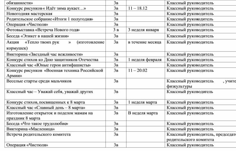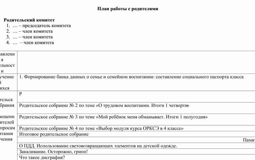 1. Оказание помощи в организации и проведении школьных и классных праздников 2. Встречи родительского комитета |