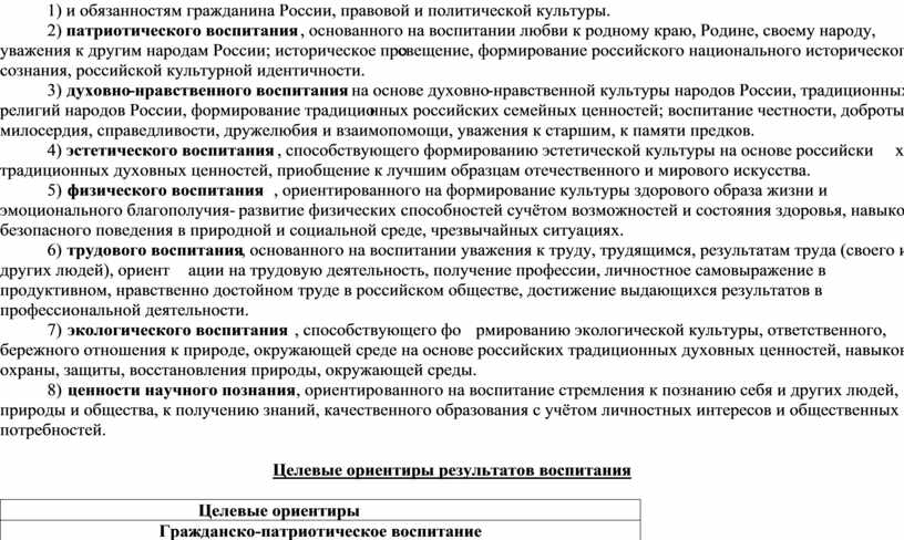1) гражданского воспитания, способствующего формированию российской гражданской идентичности, принадлежности к общности граждан Российской Федерации, к народу России как источнику власти в Российском государстве и субъекту тысячелетней российской государственности, уважения к правам, свободам и обязанностям гражданина России, правовой и политической культуры.