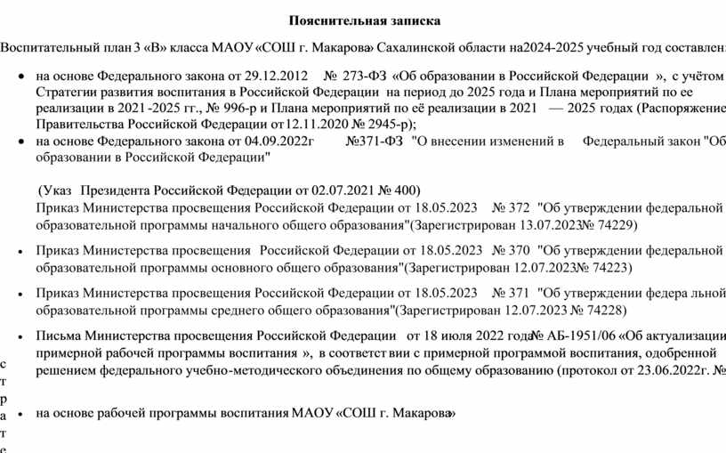 Воспитательный план 3 «В» класса МАОУ «СОШ г. Макарова» Сахалинской области на 2024-2025 учебный год составлен: