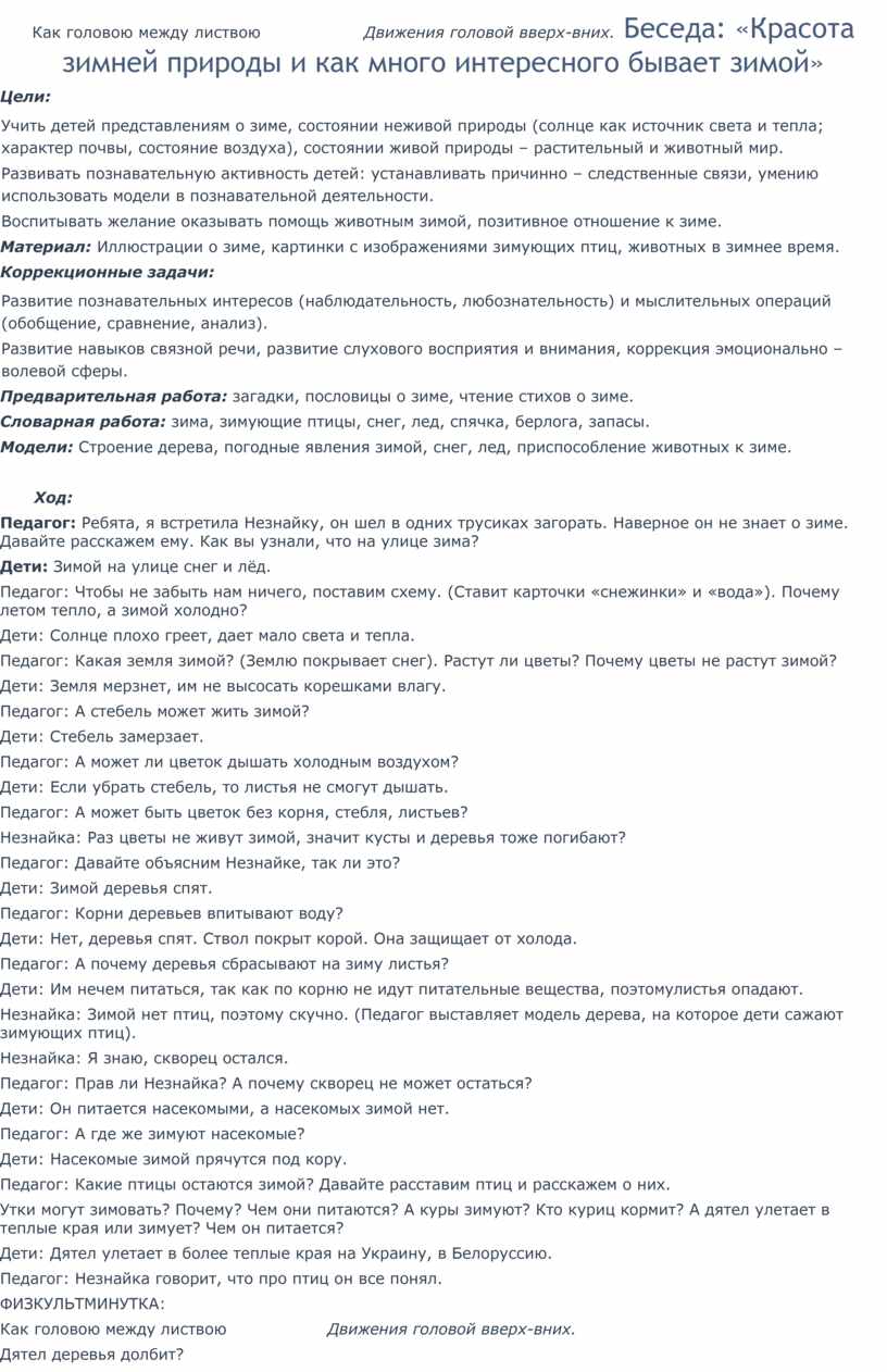 Как головою между листвою Движения головой вверх-вних. Беседа: «Красота зимней природы и как много интересного бывает зимой»