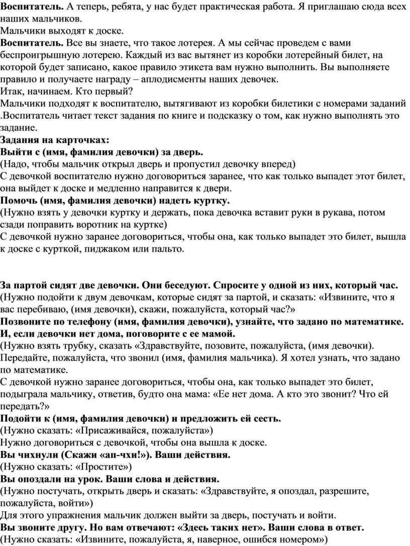 Воспитатель. Все вы знаете, что такое лотерея. А мы сейчас проведем с вами беспроигрышную лотерею. Каждый из вас вытянет из коробки лотерейный билет, на которой будет записано, какое правило этикета вам нужно выполнить. Вы выполняете правило и получаете награду – аплодисменты наших девочек.