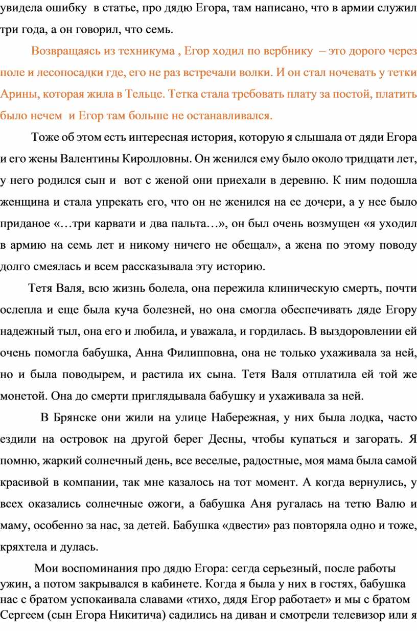 Тетя Валя, всю жизнь болела, она пережила клиническую смерть, почти ослепла и еще была куча болезней, но она смогла обеспечивать дяде Егору надежный тыл, она его и любила, и уважала, и гордилась. В выздоровлении ей очень помогла бабушка, Анна Филипповна, она не только ухаживала за ней, но и была поводырем, и растила их сына. Тетя Валя отплатила ей той же монетой. Она до смерти приглядывала бабушку и ухаживала за ней.