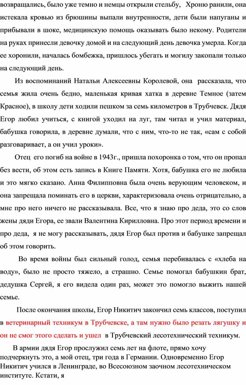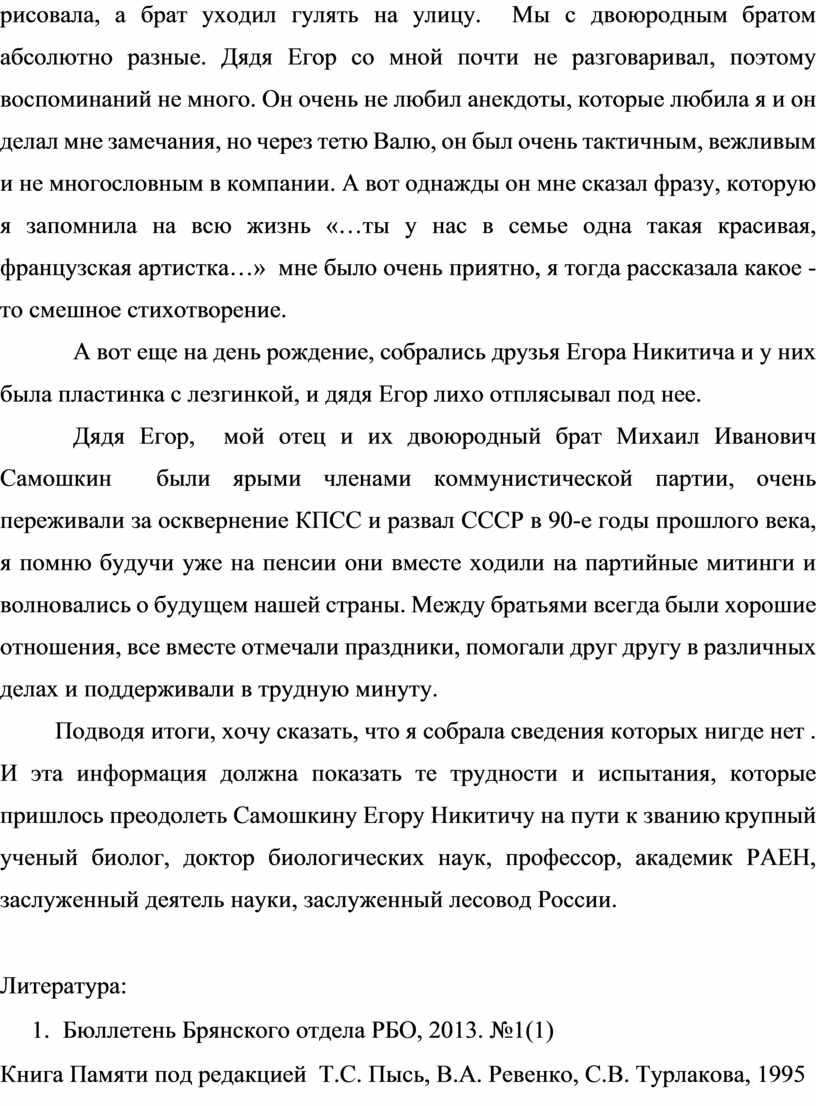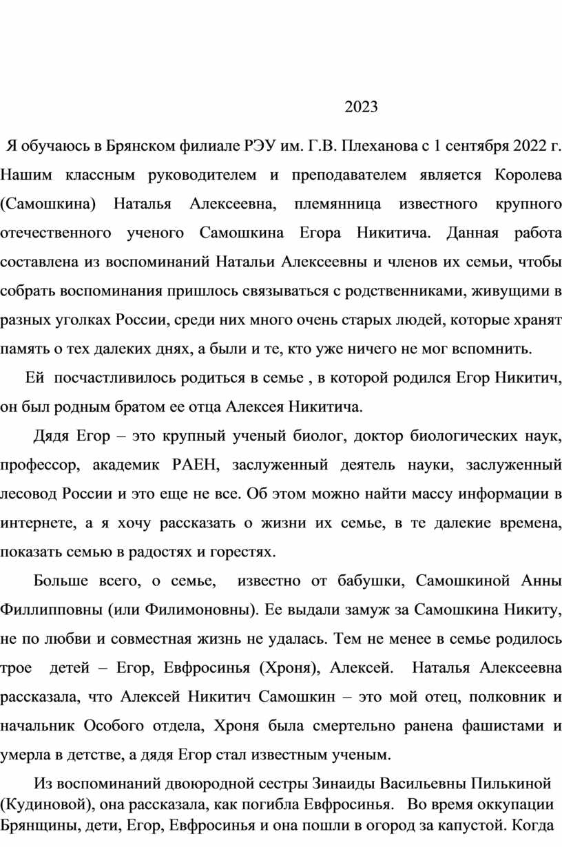 Я обучаюсь в Брянском филиале РЭУ им. Г.В. Плеханова с 1 сентября 2022 г. Нашим классным руководителем и преподавателем является Королева (Самошкина) Наталья Алексеевна, племянница известного крупного отечественного ученого Самошкина Егора Никитича. Данная работа составлена из воспоминаний Натальи Алексеевны и членов их семьи, чтобы собрать воспоминания пришлось связываться с родственниками, живущими в разных уголках России, среди них много очень старых людей, которые хранят память о тех далеких днях, а были и те, кто уже ничего не мог вспомнить.