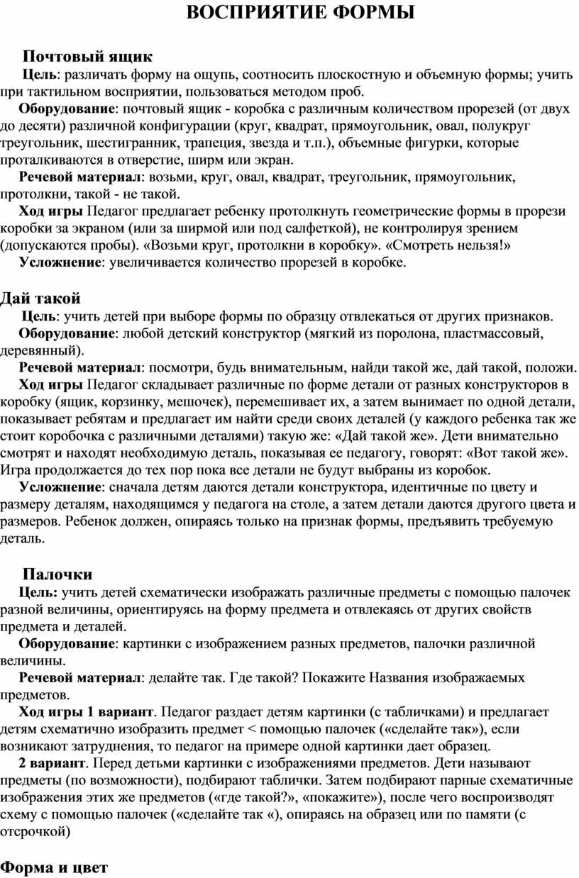 Оборудование: почтовый ящик - коробка с различным количеством прорезей (от двух до десяти) различной конфигурации (круг, квадрат, прямоугольник, овал, полукруг треугольник, шестигранник, трапеция, звезда и т.п.), объемные фигурки, которые проталкиваются в отверстие, ширм или экран.