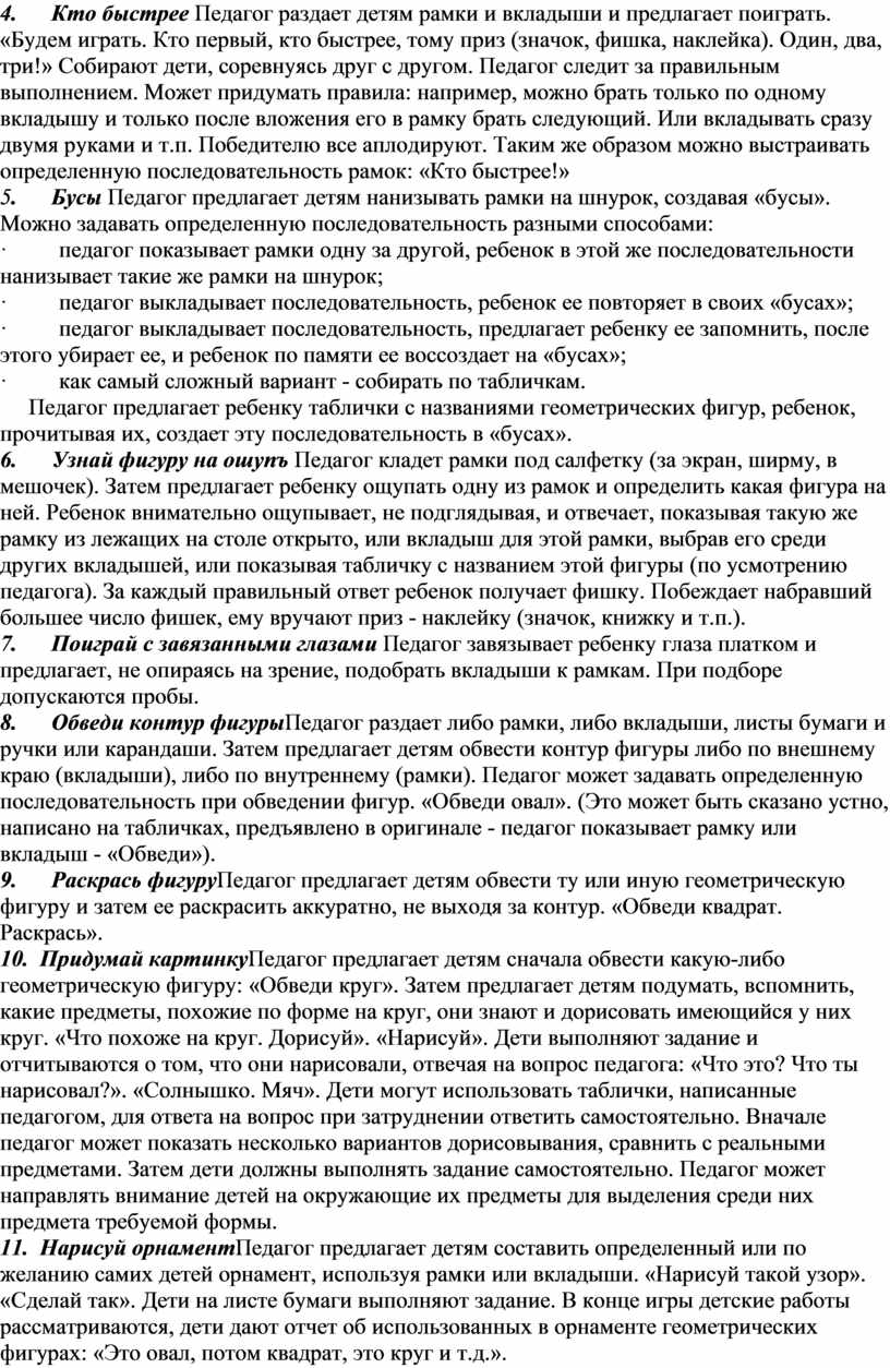 1. Подбери вкладыши к рамкамПедагог раздает детям рамки и вкладыши и предлагает вначале в какой-либо последовательности скрепить между собой рамки, а затем подобрать к ним соответствующие вкладыши: «Посмотри, сложи, подбери нужную форму». Дети берут по одному вкладышу и ищут подходящую рамку. На начальном этапе возможны пробы, затем ребенок должен уже визуально сразу определять к какой рамке подходит взятый им вкладыш. Знакомые геометрические формы могут быть названы детьми устно или по табличкам (круг, треугольник, квадрат, овал).
