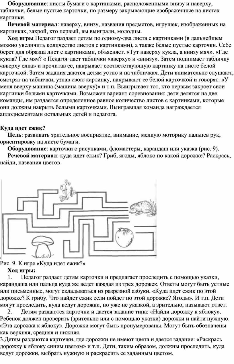 1. Педагог раздает детям карточки и предлагает проследить с помощью указки, карандаша или пальца куда же ведет каждая из трех дорожек. Ответы могут быть устные или письменные, могут складываться из разрезной азбуки. «Куда идет ежик по этой дорожке? К грибу. Что найдет ежик если пойдет по этой дорожке? Ягоды». И т.п. Дети могут проследить, куда ведут дорожки, но уже не указкой, а зрительно, называют ответ.