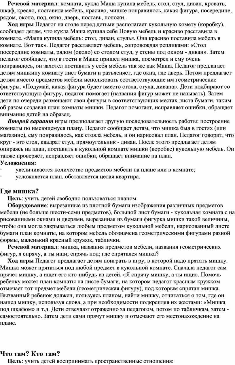 Ход игры Педагог на столе перед детьми располагает кукольную комету (коробку), сообщает детям, что кукла Маша купила себе Новую мебель и красиво расставила в комнате. «Маша купила мебель: стол, диван, стулья. Она красиво поставила мебель в комнате. Вот так». Педагог расставляет мебель, сопровождая репликами: «Стол посередине комнаты, рядом (около) со столом стул, у стены под окном - диван». Затем педагог сообщает, что в гости к Маше пришел мишка, посмотрел и ему очень понравилось, он захотел поставить у себя мебель так же как Маша. Педагог предлагает детям мишкину комнату лист бумаги и разъясняет, где окна, где дверь. Потом предлагает детям вместо предметов мебели использовать соответствующие им геометрические фигуры. «Подумай, какая фигура будет вместо стола, стула, дивана». Дети подбирают со ответствующую фигуру, педагог помогает (названия фигур может не называть). Затем дети по очереди размещают свои фигуры в соответствующих местах листа бумаги, таким об разом создавая план комнаты мишки. Педагог помогает, исправляет ошибки, обращает внимание детей на образец.