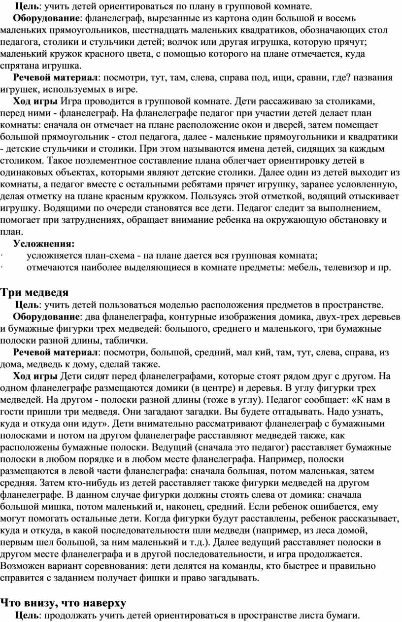 Ход игры Педагог раздает детям по одному-два листа с картинками (в дальнейшем можно увеличить количество листов с картинками), а также белые пустые карточки. Себе берет для образца лист с картинками, объясняет. «Тут наверху кукла, а внизу мяч». «Где кукла? Где мяч? « Педагог дает таблички «вверху» и «внизу». Затем поднимает табличку «вверху елка» и прочитав ее, накрывает соответствующую картинку на листе белой карточкой. Затем задания даются детям устно и на табличках. Дети внимательно слушают, смотрят на таблички, узнав свою картинку, накрывают ее белой карточкой и говорят: «У меня вверху машина (машина вверху)» и т.п. Выигрывает тот, кто первым закроет свои картинки белыми карточками. Возможен вариант соревнования: дети делятся на две команды, им раздается определенное равное количество листов с картинками, которые они должны накрыть белыми карточками. Выигравшая команда награждается аплодисментами остальных детей и педагога.