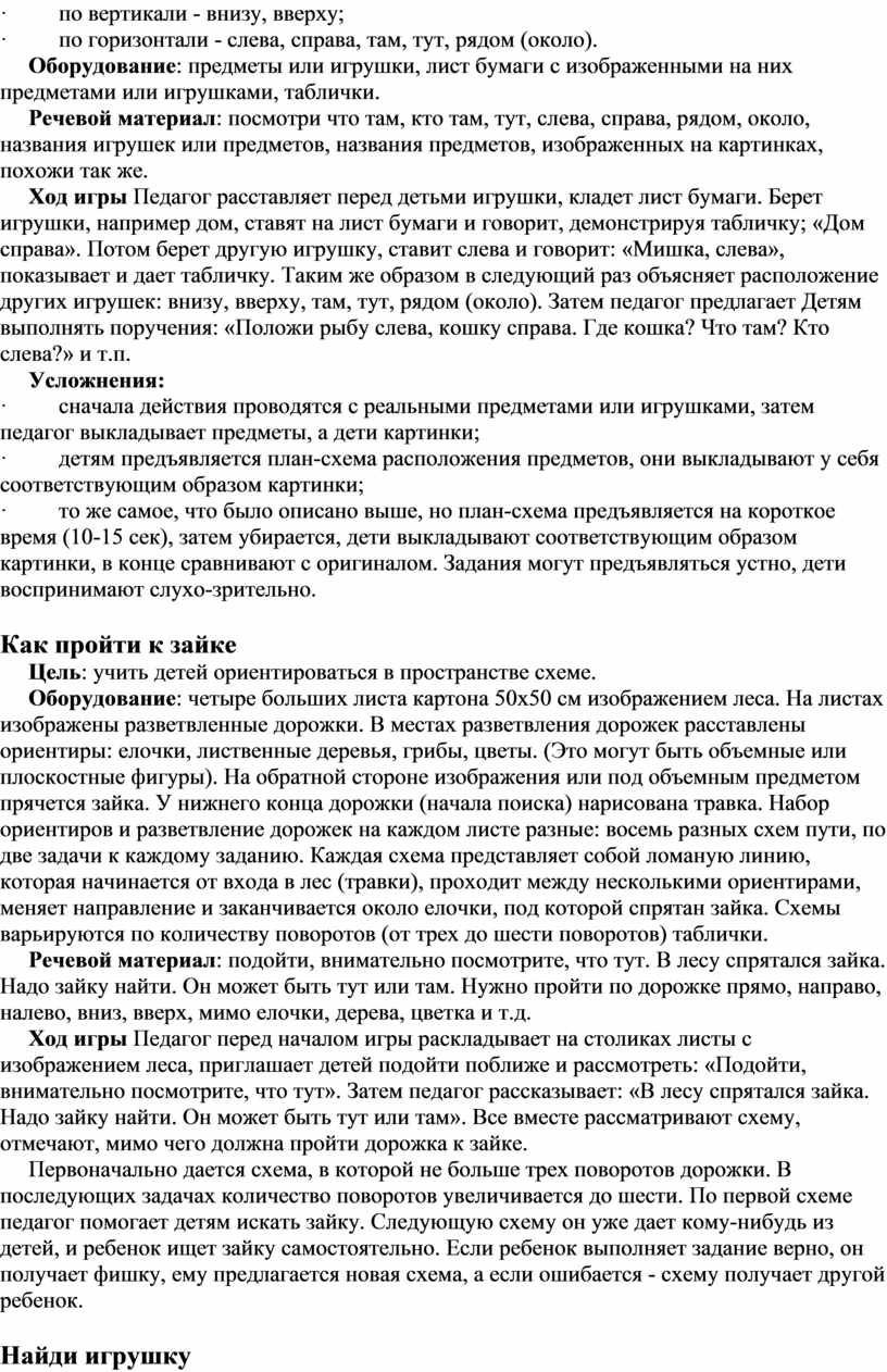Речевой материал: подойти, внимательно посмотрите, что тут. В лесу спрятался зайка. Надо зайку найти. Он может быть тут или там. Нужно пройти по дорожке прямо, направо, налево, вниз, вверх, мимо елочки, дерева, цветка и т.д.