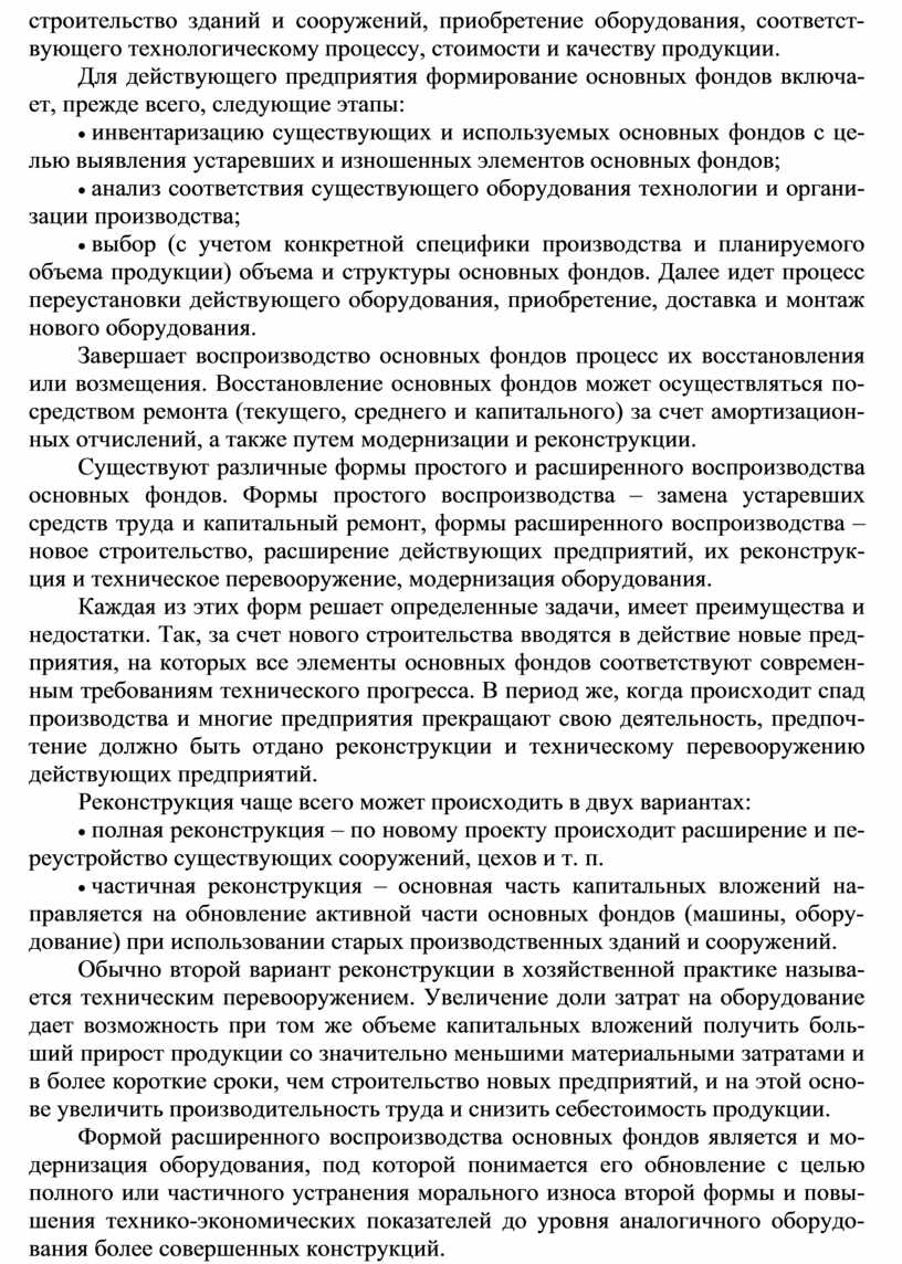Существуют различные формы простого и расширенного воспроизводства основных фондов. Формы простого воспроизводства – замена устаревших средств труда и капитальный ремонт, формы расширенного воспроизводства – новое строительство, расширение действующих предприятий, их реконструк- ция и техническое перевооружение, модернизация оборудования.