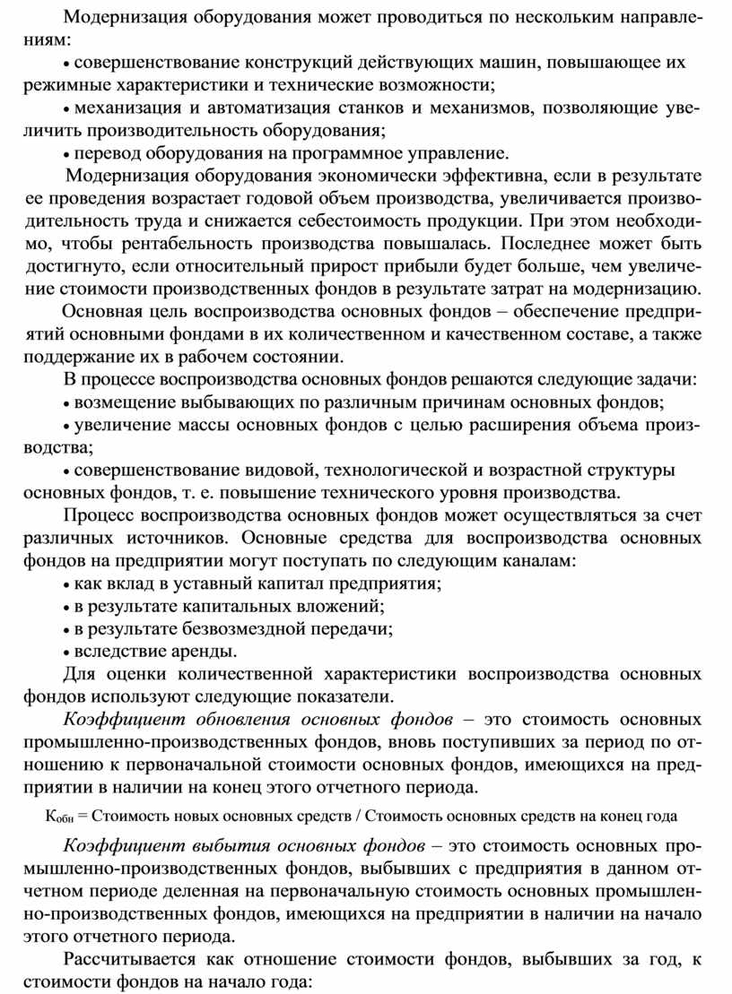 Формой расширенного воспроизводства основных фондов является и мо- дернизация оборудования, под которой понимается его обновление с целью полного или частичного устранения морального износа второй формы и повы- шения технико-экономических показателей до уровня аналогичного оборудо- вания более совершенных конструкций.