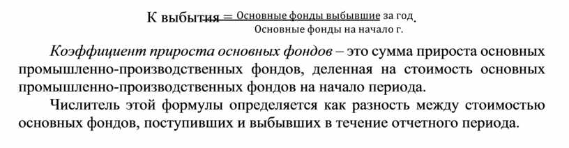 Коэффициент выбытия основных фондов – это стоимость основных про- мышленно-производственных фондов, выбывших с предприятия в данном от- четном периоде деленная на первоначальную стоимость основных промышлен- но-производственных фондов, имеющихся на предприятии в наличии на начало этого отчетного периода.