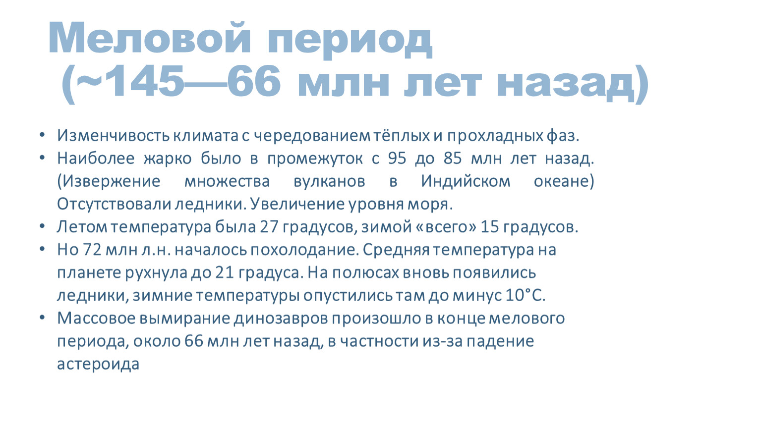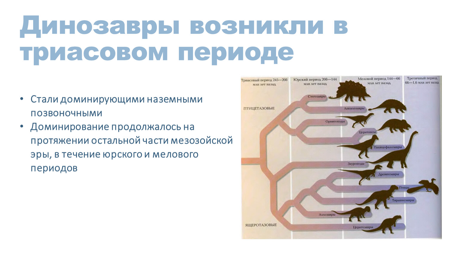 Массовое вымирание динозавров произошло в конце мелового периода, около 66 млн лет назад, в частности из-за падение астероида