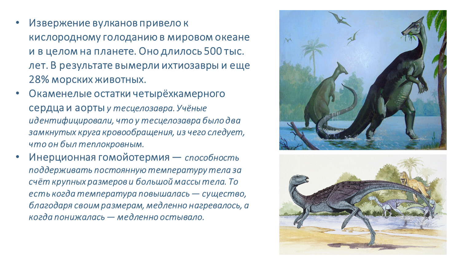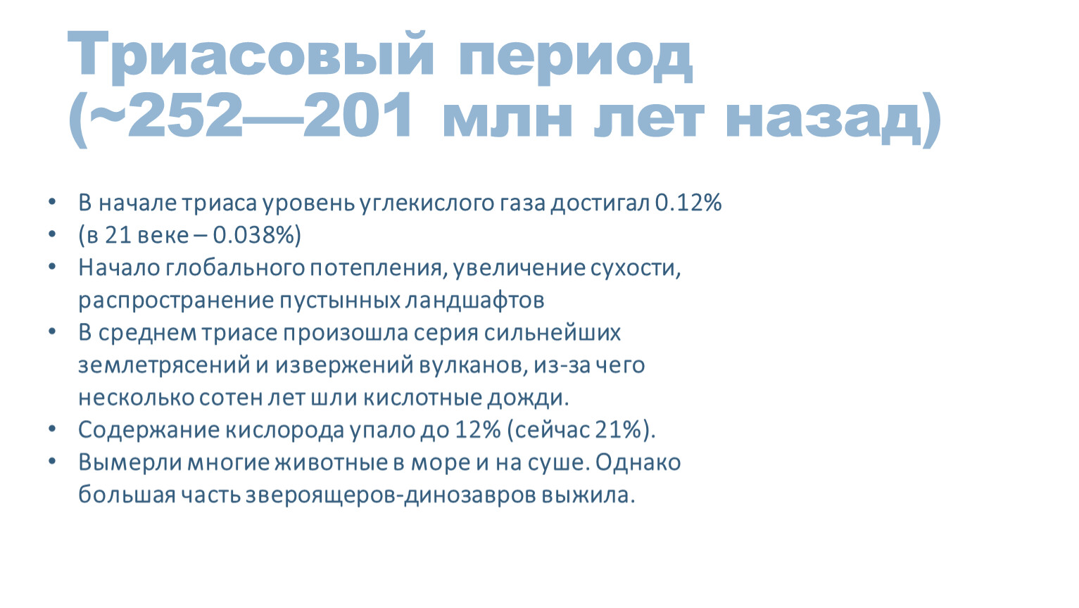 Вымерли многие животные в море и на суше. Однако большая часть звероящеров-динозавров выжила.