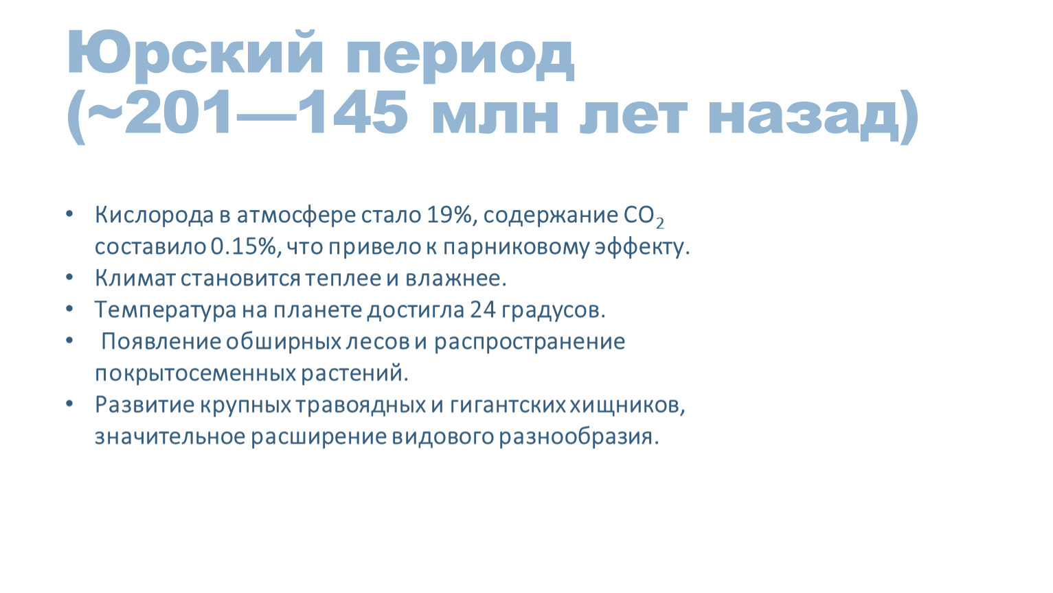 Тёплый климат на протяжении всего периода. В течение 180 млн лет даже в приполярных областях не было устойчивого ледяного покрова