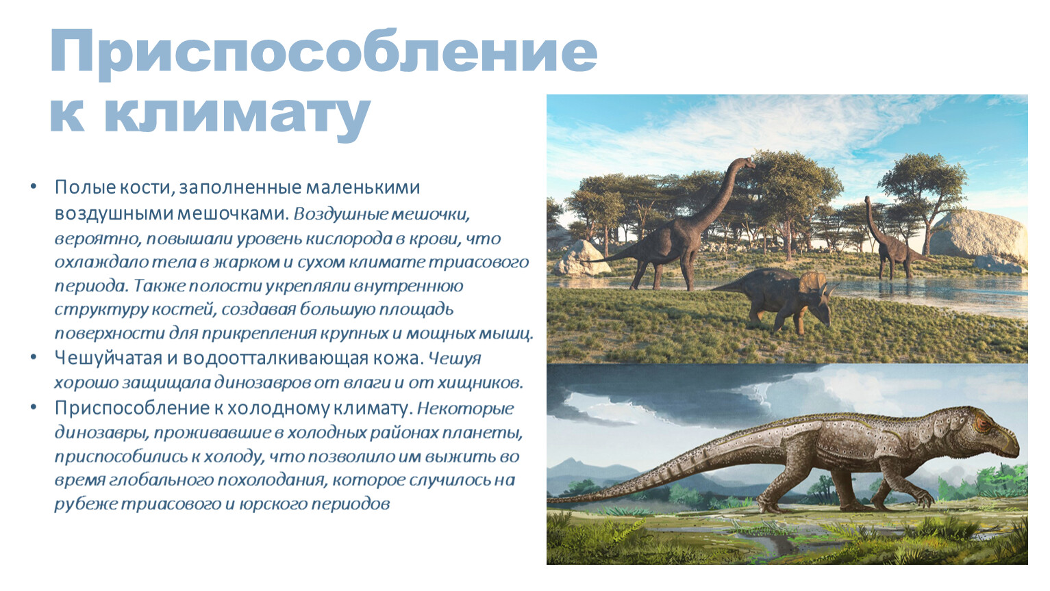 Приспособление к холодному климату. Некоторые динозавры, проживавшие в холодных районах планеты, приспособились к холоду, что позволило им выжить во время глобального похолодания, которое случилось на рубеже триасового и юрского периодов