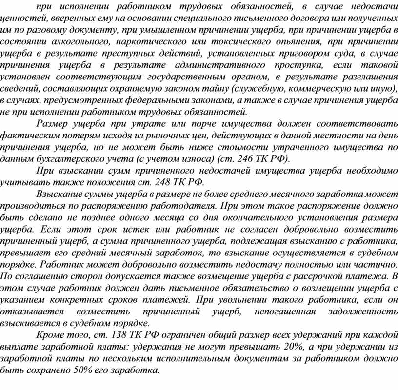 Возмещение ущерба в полном размере предусмотрено, например, в случаях, когда в соответствии с ТК РФ или федеральными законами на работника возложена материальная ответственность в полном размере за ущерб, причиненный работодателю при исполнении работником трудовых обязанностей, в случае недостачи ценностей, вверенных ему на основании специального письменного договора или полученных им по разовому документу, при умышленном причинении ущерба, при причинении ущерба в состоянии алкогольного, наркотического или токсического опьянения, при причинении ущерба в результате преступных действий, установленных приговором суда, в случае причинения ущерба в результате административного проступка, если таковой установлен соответствующим государственным органом, в результате разглашения сведений, составляющих охраняемую законом тайну (служебную, коммерческую или иную), в случаях, предусмотренных федеральными законами, а также в случае причинения ущерба не при исполнении работником трудовых обязанностей.