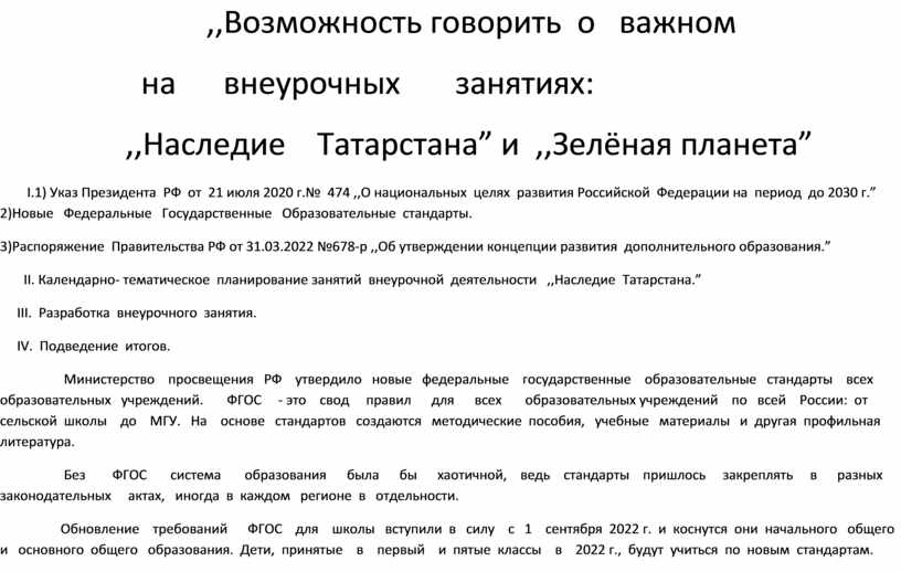 I.1) Указ Президента РФ от 21 июля 2020 г.№ 474 ,,О национальных целях развития Российской Федерации на период до 2030 г.” 2)Новые Федеральные Государственные Образовательные стандарты.