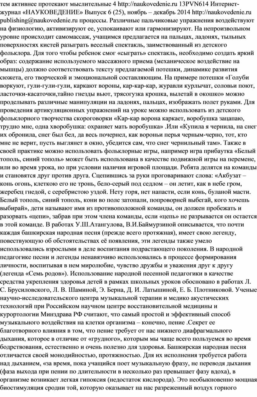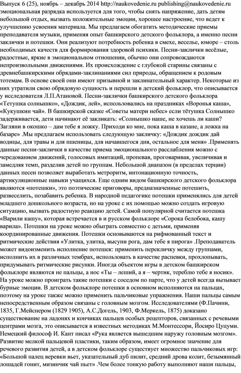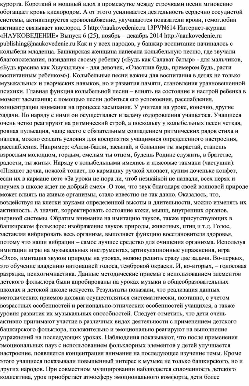 Современная образовательная стратегия обучения нацеливает деятельность образовательных учреждений на поиск наиболее интегративных подходов в вопросах сохранения и укрепления здоровья учащихся. В Законе Российской Федерации «Об образовании» статье 51, подчёркивается, что образовательное учреждение должно создавать условия, гарантирующие охрану и укрепление здоровья обучающихся и воспитанников .Более того, в плане действий по модернизации общего образования на 2011-2015 годы2, в Федеральных государственных образовательных стандартах [6], в реализации образовательных президентских приоритетах «Наша новая школа» определяется чётко встроенная стратегия здоровьесбережения касательно образовательных структур. Опираясь на данные нормативно-правовых документов мы рассмотрели возможность укрепления психического здоровья учащихся не только на уроках физкультуры, но и предметах эстетического цикла, в частности на уроке музыки. Необходимо отметить, что в показатели психического здоровья относятся: способность сознания человека использовать отображение внешнего мира, осознавать свои эмоции и поведение, справляться со стрессами и использовать положительные эмоции для повышения уровня здоровья. Диагностика психического здоровья включает выявление особенностей познавательных процессов, поведения и общения школьников, особенностей эмоционально-мотивационной сферы, его отношений к миру и самому себе. Мы использовали многовековой опыт воспитания детей, сконцентрированный в детском музыкальном фольклоре башкирского народа. В работах Кашаповой Л.М., Султангареевой Р.А, Сулейманова Р.С. на практических примерах подтверждается обширный этнокультурный потенциал башкирского музыкального творчества. Наиболее развитыми формами башкирского народного фольклорного творчества являются сольное пение, танец и игра на музыкальных инструментах. Поэтому в системе эстетического воспитания подрастающего поколения у башкир ведущая роль отводилась музыкальному творчеству как средству наиболее эффективного воздействия на эмоциональный мир человека. Обращаясь к народным башкирским традициям, мы находим не только множество красивых мелодий и песен, но и советы – как учить музыке, как воспитывать любовь к ней. В комплексе народных средств ведущее место отводится детскому музыкальному фольклору. По мнению Г.С. Виноградова, детский фольклор, вызван к жизни «педагогическими надобностями народа, чтобы вырастить человека, здорового и телом, и душой» [2, с. 60]. В истории башкирского детского фольклора имеется множество образцов творчества, в них отмечается соединение мелодико-ритмических интонаций с поэтическим текстом и танцевально-игровыми движениями. «Отдельные игровые песни, считалки, песни-заклички связаны с древнебашкирскими обрядами-заклинаниями сил природы, обращениями к родовым тотемам» .У А.М. Сулейманова, Ф.А. Надыршиной, Р.А. Султангареевой описывается, что некоторые заклинательные песни, ритуальные пляски и действа, возгласы-кличи утратили свою обрядовую сущность, но приобрели актуальность в современном детском игровом фольклоре. Проанализировав изученный материал можно предположить, что, используя фольклорные элементы башкирского музыкального творчества на уроках музыки, можно параллельно решить задачи здоровь