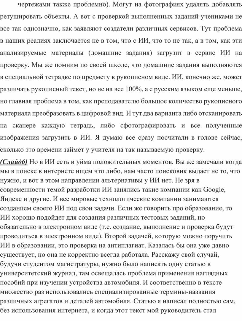 (Слайд6) Но в ИИ есть и уйма положительных моментов. Вы же замечали когда мы в поиске в интернете ищем что либо, нам часто поисковик выдает не то, что нужно, и вот в этом направлении альтернативы у ИИ нет. Не зря в современности темой разработки ИИ занялись такие компании как Google, Яндекс и другие. И все мировые технологические компании занимаются созданием своего ИИ под свои задачи. Если же говорить про образование, то ИИ хорошо подойдет для создания различных тестовых заданий, но обязательно в электронном виде (т.е. создание, выполнение и проверка будут проводиться в электронном виде). Второй задачей, которую можно поручить ИИ в образовании, это проверка на антиплагиат. Казалась бы она уже давно существует, но она не корректно всегда работала. Расскажу свой случай, будучи студентом магистратуры, нужно было написать одну статью в университетский журнал, там освещалась проблема применения наглядных пособий при изучении устройства автомобиля. И соответственно в тексте множество раз использовались специализированные термины-названия различных агрегатов и деталей автомобиля. Статью я написал полностью сам, без использования интернета, и когда этот текст мой руководитель стал проверять на плагиат в системе, эта программа выдала авторства 60%, благо что можно было посмотреть, какие выражения и слова не понравились антиплагиату, и он, разумеется, выделил красным (т.е. как заимствованными) все специализированные термины и называния. Руководитель посмотрел это и конечно же понял, что это ошибка в системе и эти термины нельзя заменить на какие либо другие, и зачел мне проверку на плагиат как 100% авторства. Так вот при применении ИИ в подобной системе антиплагиат, то ИИ уже подобных ошибок не делает, т.е. более качественно работает. Хотя как утверждают разработчики подобных ИИ, что с техническими направлениями ИИ так же не всегда не корректно работает.