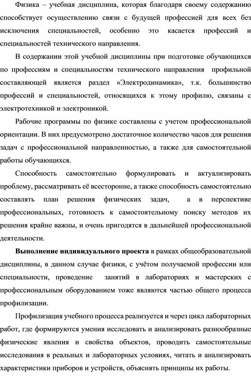 В содержании этой учебной дисциплины при подготовке обучающихся по профессиям и специальностям технического направления профильной составляющей является раздел «Электродинамика», т.к. большинство профессий и специальностей, относящихся к этому профилю, связаны с электротехникой и электроникой.