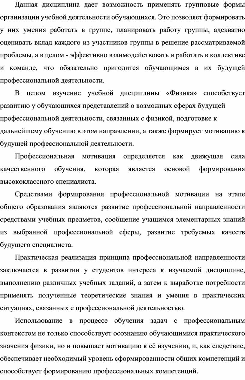 В целом изучение учебной дисциплины «Физика» способствует развитию у обучающихся представлений о возможных сферах будущей