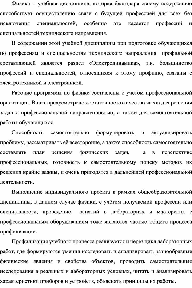 В содержании этой учебной дисциплины при подготовке обучающихся по профессиям и специальностям технического направления профильной составляющей является раздел «Электродинамика», т.к. большинство профессий и специальностей, относящихся к этому профилю, связаны с электротехникой и электроникой.