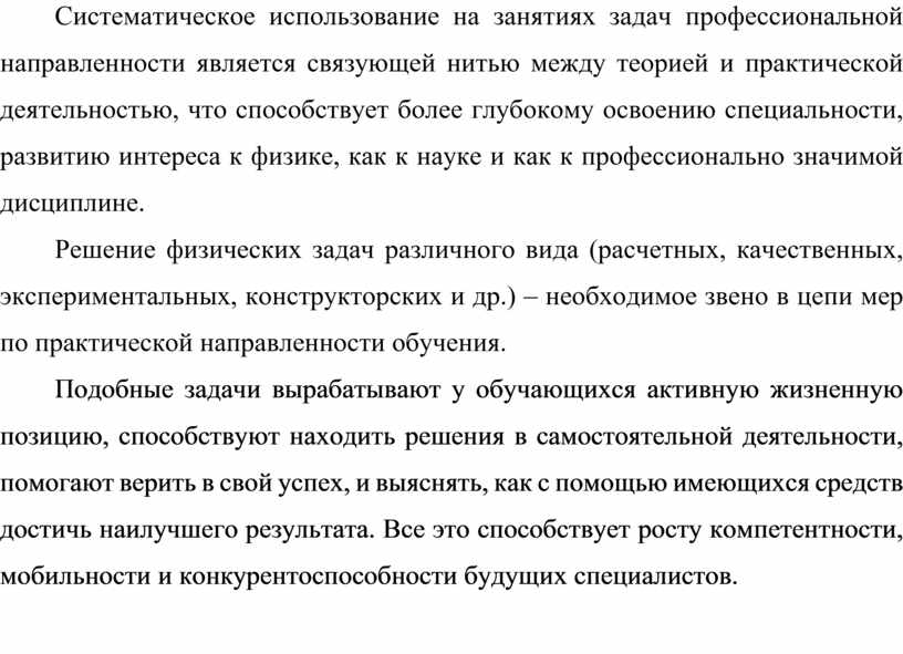 Систематическое использование на занятиях задач профессиональной направленности является связующей нитью между теорией и практической деятельностью, что способствует более глубокому освоению специальности, развитию интереса к физике, как к науке и как к профессионально значимой дисциплине.