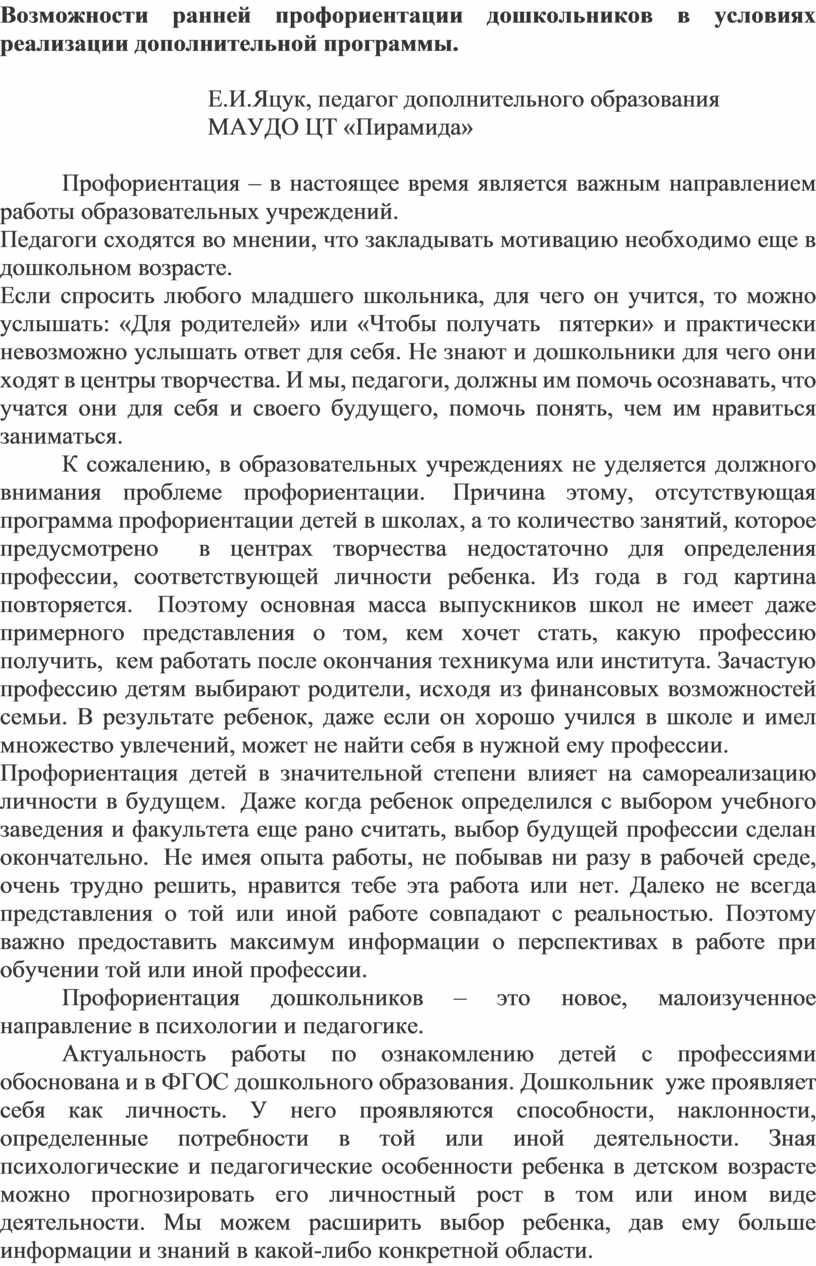 Возможности ранней профориентации дошкольников в условиях реализации дополнительной программы.