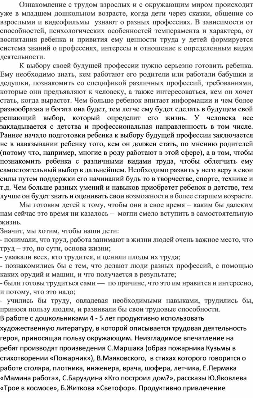Ознакомление с трудом взрослых и с окружающим миром происходит уже в младшем дошкольном возрасте, когда дети через сказки, общение со взрослыми и видеофильмы узнают о разных профессиях. В зависимости от способностей, психологических особенностей темперамента и характера, от воспитания ребенка и привития ему ценности труда у детей формируется система знаний о профессиях, интересы и отношение к определенным видам деятельности.