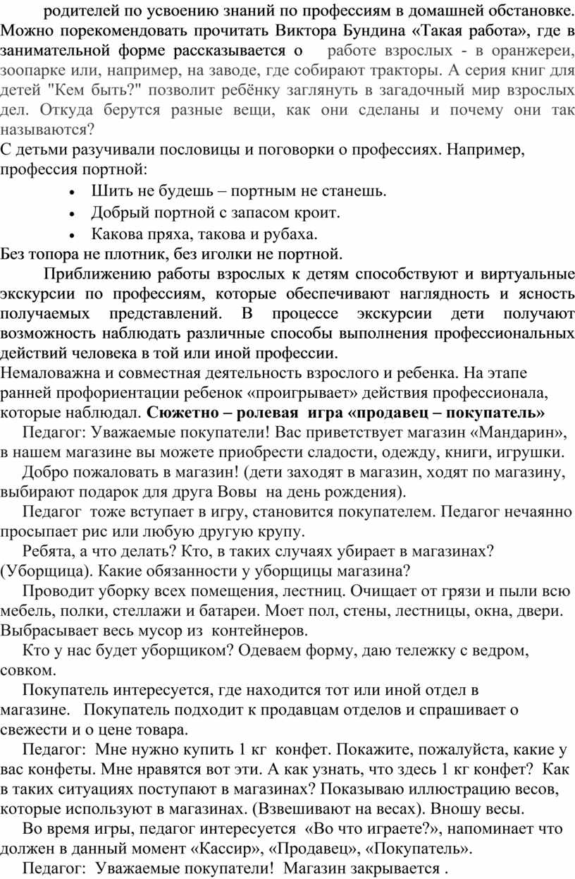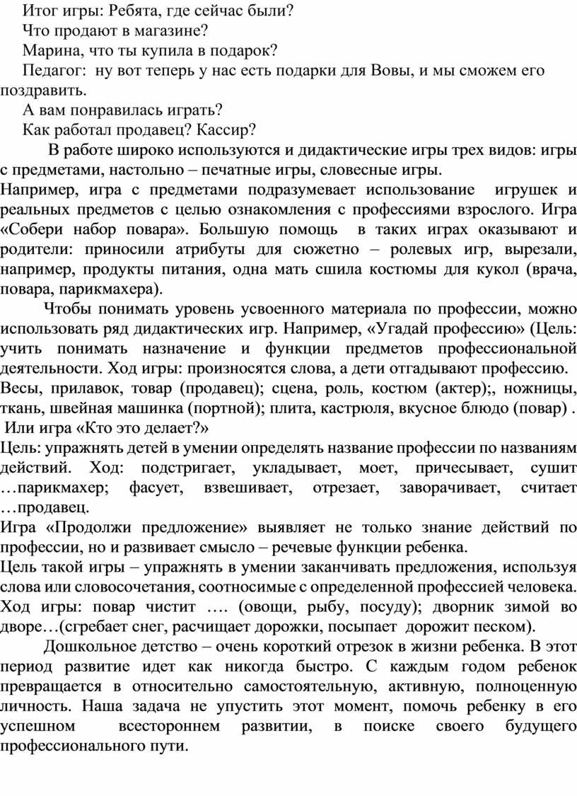 Немаловажна и совместная деятельность взрослого и ребенка. На этапе ранней профориентации ребенок «проигрывает» действия профессионала, которые наблюдал. Сюжетно – ролевая игра «продавец – покупатель»
