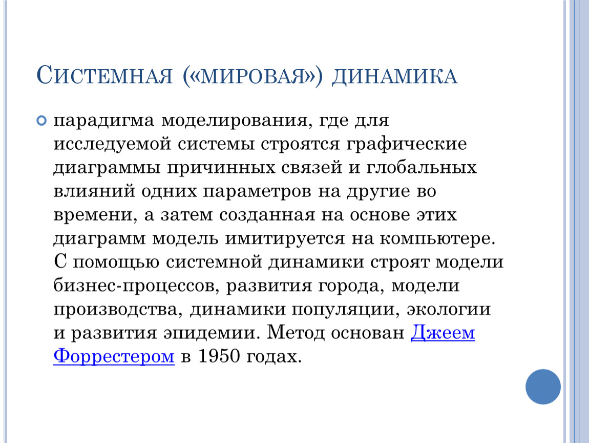 парадигма моделирования, где для исследуемой системы строятся графические диаграммы причинных связей и глобальных влияний одних параметров на другие во времени, а затем созданная на основе этих диаграмм модель имитируется на компьютере. С помощью системной динамики строят модели бизнес-процессов, развития города, модели производства, динамики популяции, экологии и развития эпидемии. Метод основан Джеем Форрестером в 1950 годах.