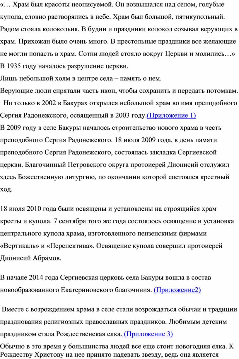 Но только в 2002 в Бакурах открылся небольшой храм во имя преподобного Сергия Радонежского, освященный в 2003 году.(Приложение 1)