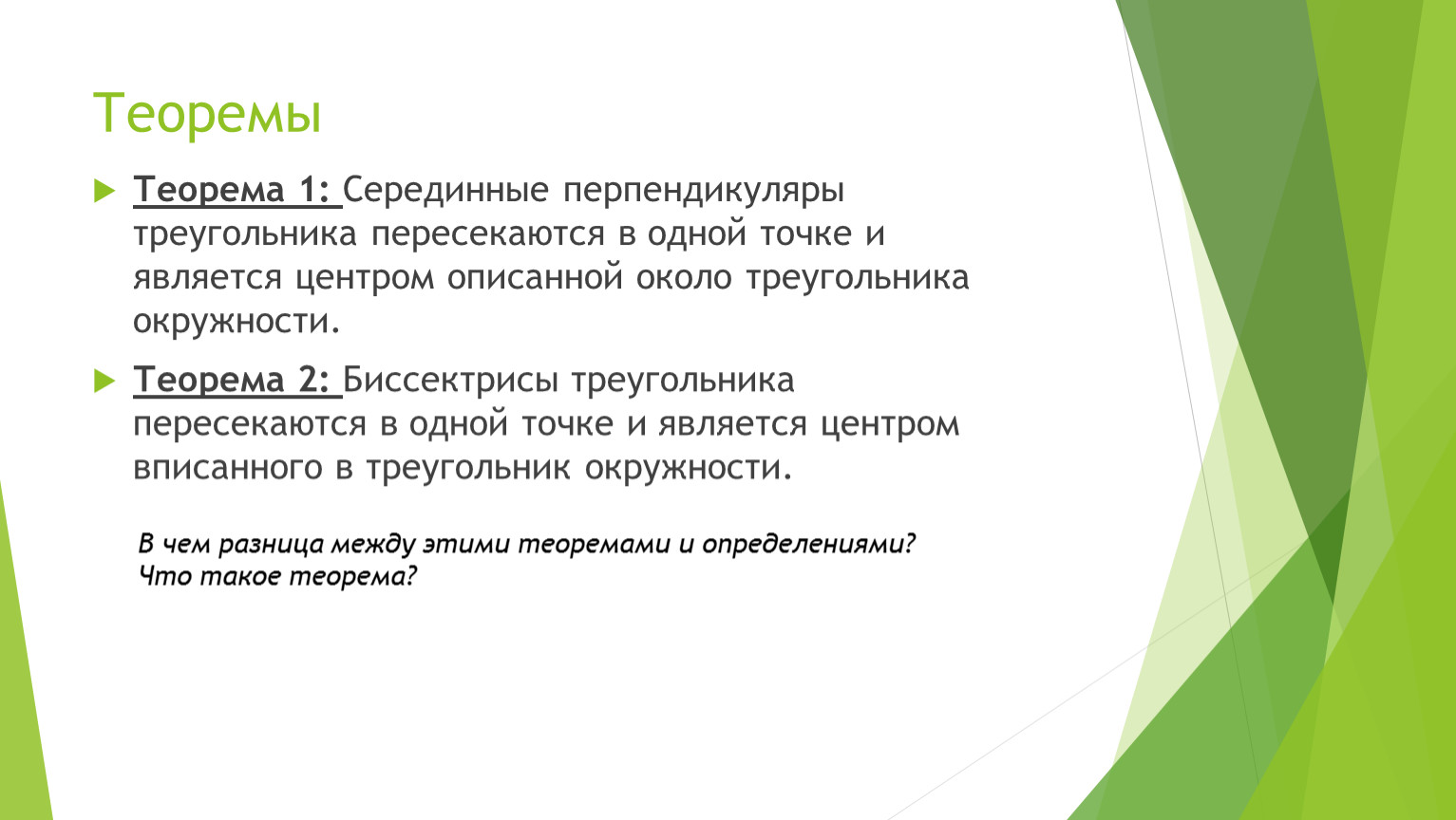 | - доказывает свойства серединного перпендикуляра и биссектрисы; |