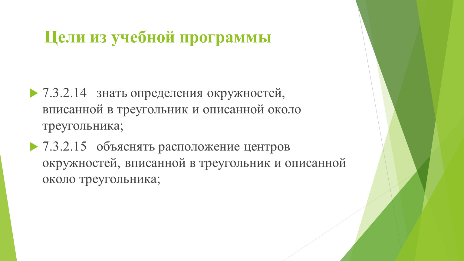 7.3.2.15 объяснять расположение центров окружностей, вписанной в треугольник и описанной около треугольника;