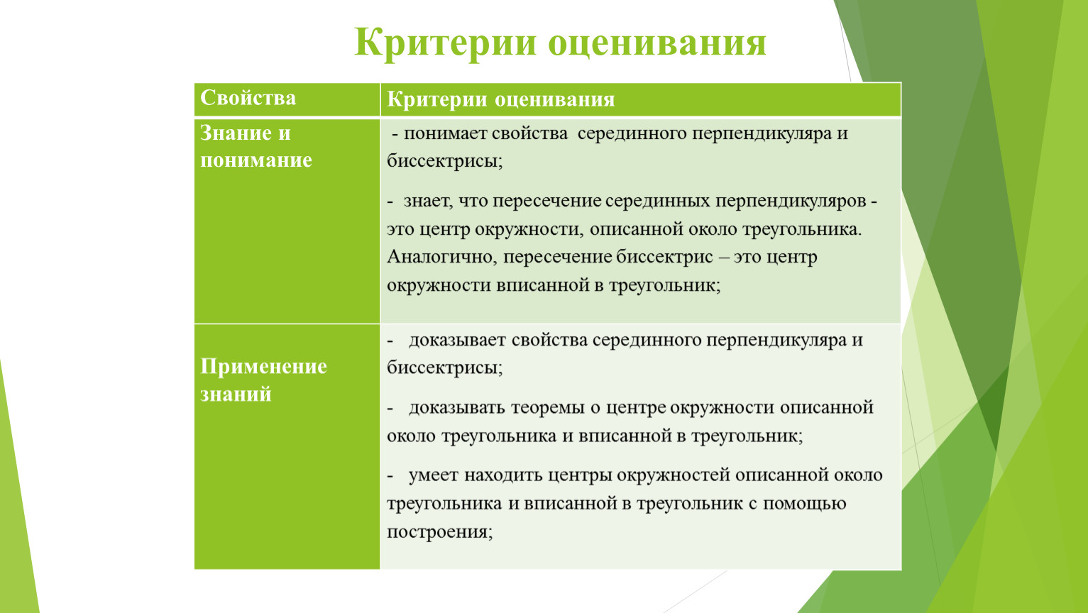 Знание и понимание | - понимает свойства серединного перпендикуляра и биссектрисы; |