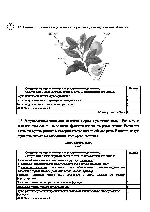 1.1. Покажите стрелками и подпишите на рисунке лист, цветок, семя и плод лимона.