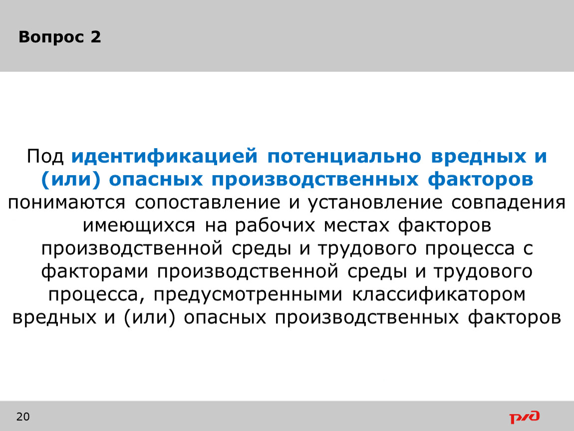 Под идентификацией потенциально вредных и (или) опасных производственных факторов понимаются сопоставление и установление совпадения имеющихся на рабочих местах факторов производственной среды и трудового процесса с факторами производственной среды и трудового процесса, предусмотренными классификатором вредных и (или) опасных производственных факторов