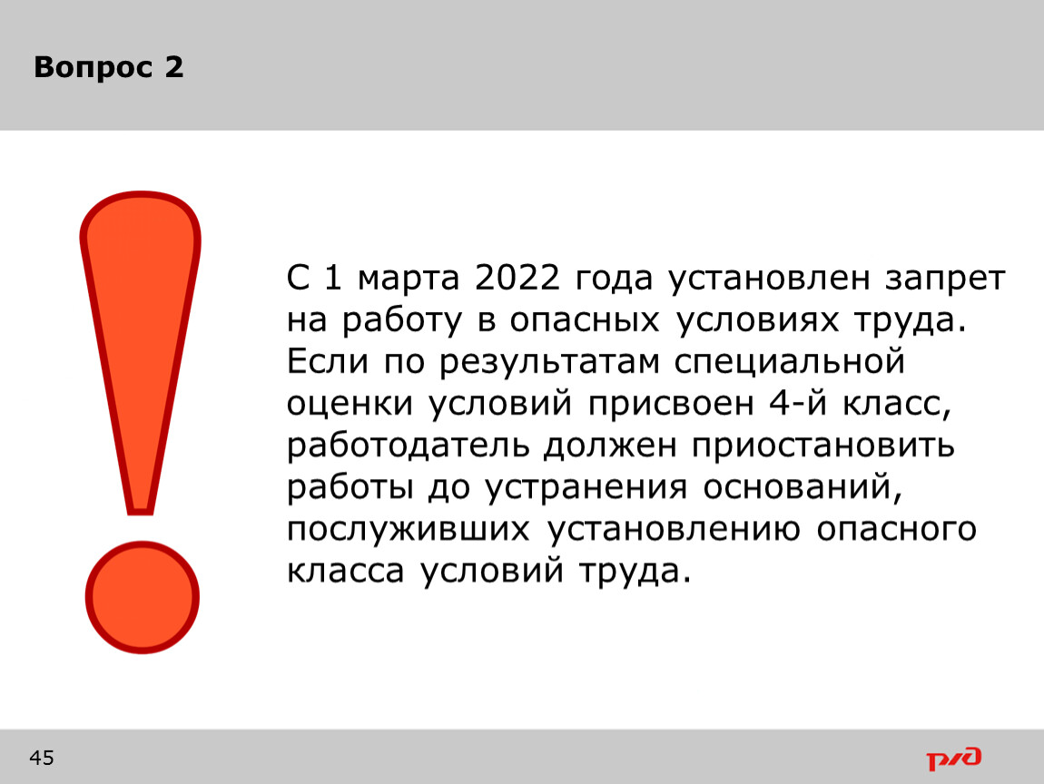 С 1 марта 2022 года установлен запрет на работу в опасных условиях труда. Если по результатам специальной оценки условий присвоен 4-й класс, работодатель должен приостановить работы до устранения оснований, послуживших установлению опасного класса условий труда.