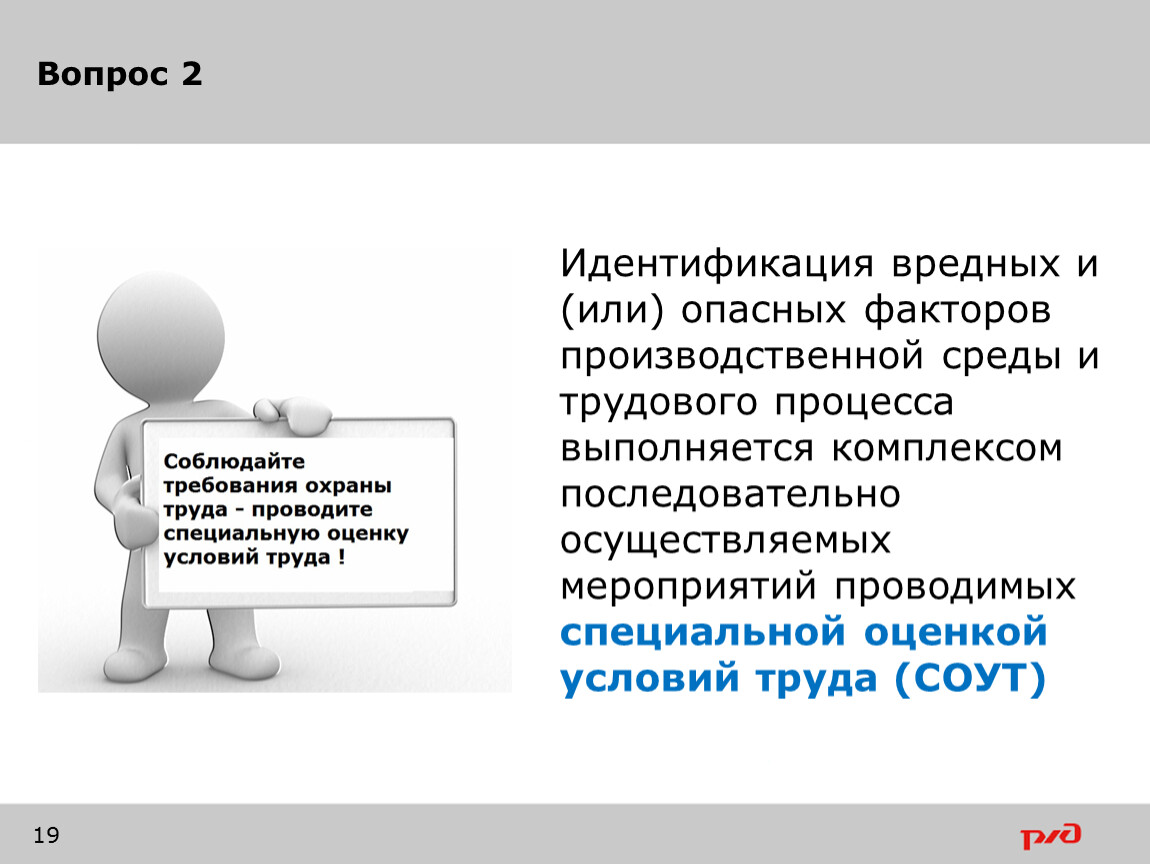 Идентификация вредных и (или) опасных факторов производственной среды и трудового процесса выполняется комплексом последовательно осуществляемых мероприятий проводимых специальной оценкой условий труда (СОУТ)