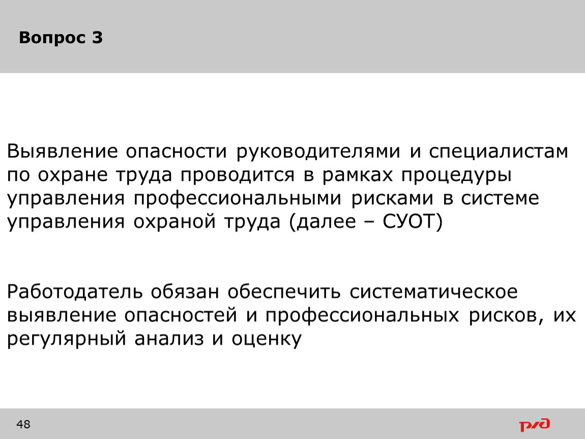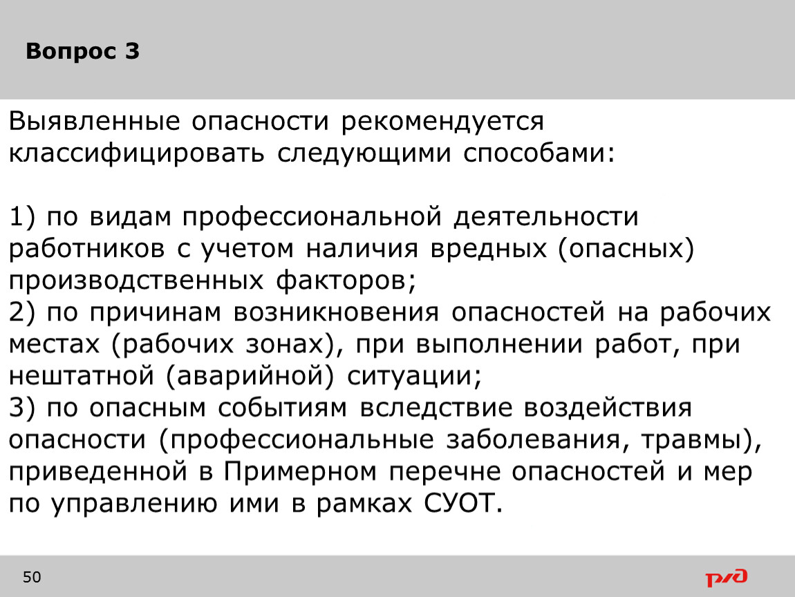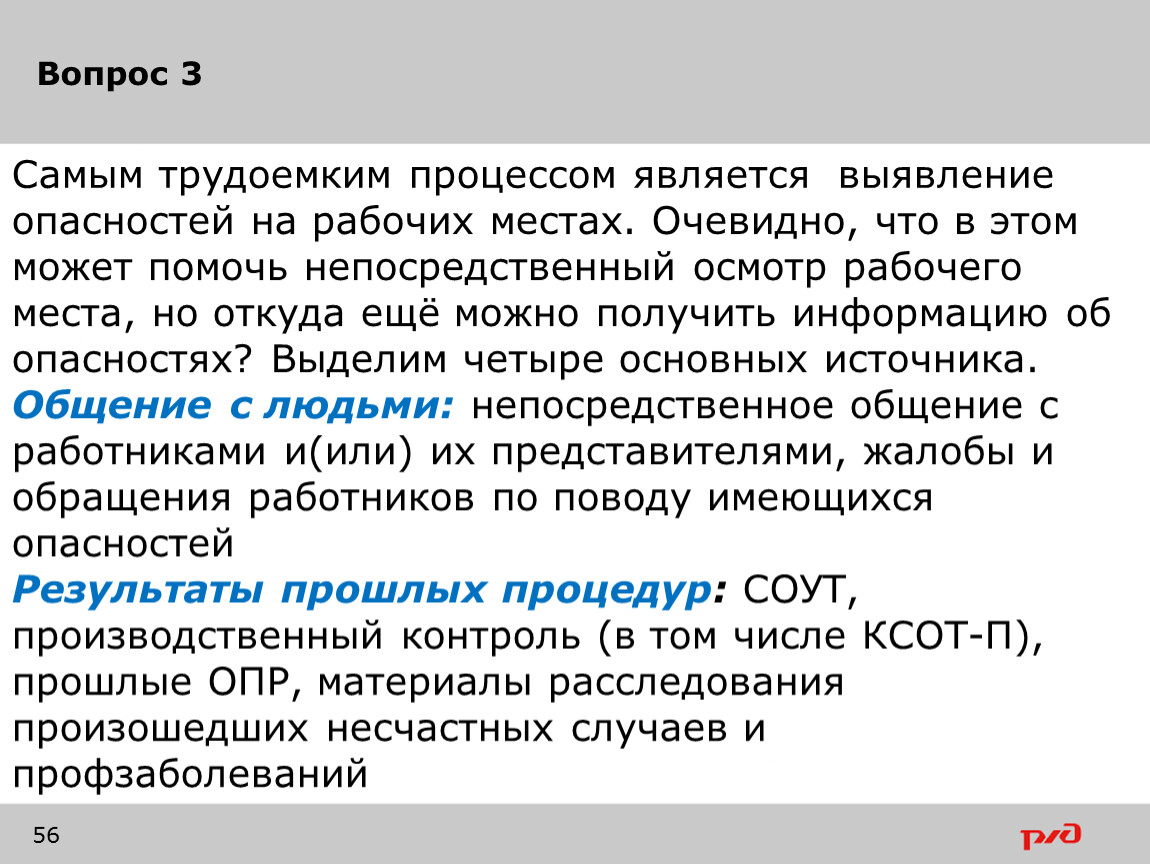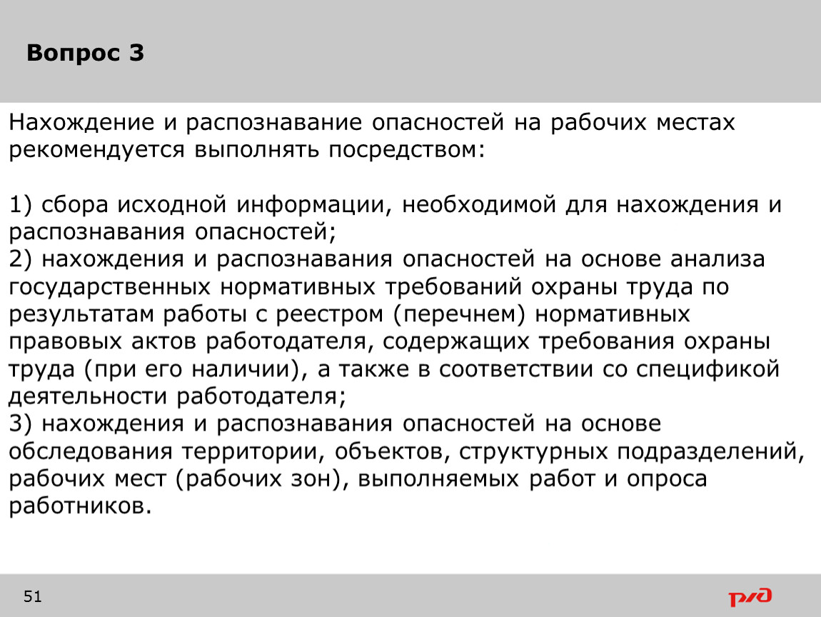 3) нахождения и распознавания опасностей на основе обследования территории, объектов, структурных подразделений, рабочих мест (рабочих зон), выполняемых работ и опроса работников.