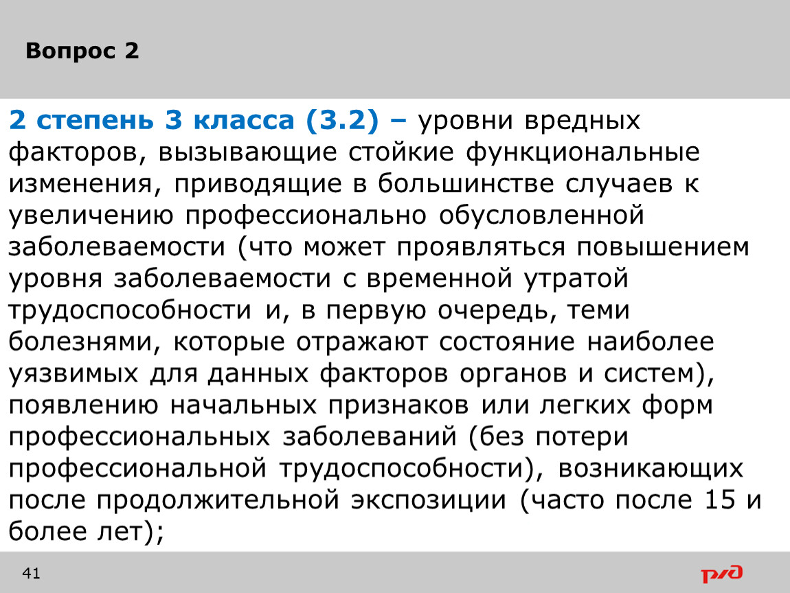2 степень 3 класса (3.2) – уровни вредных факторов, вызывающие стойкие функциональные изменения, приводящие в большинстве случаев к увеличению профессионально обусловленной заболеваемости (что может проявляться повышением уровня заболеваемости с временной утратой трудоспособности и, в первую очередь, теми болезнями, которые отражают состояние наиболее уязвимых для данных факторов органов и систем), появлению начальных признаков или легких форм профессиональных заболеваний (без потери профессиональной трудоспособности), возникающих после продолжительной экспозиции (часто после 15 и более лет);