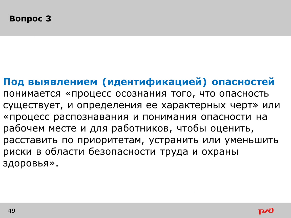 Под выявлением (идентификацией) опасностей понимается «процесс осознания того, что опасность существует, и определения ее характерных черт» или «процесс распознавания и понимания опасности на рабочем месте и для работников, чтобы оценить, расставить по приоритетам, устранить или уменьшить риски в области безопасности труда и охраны здоровья».
