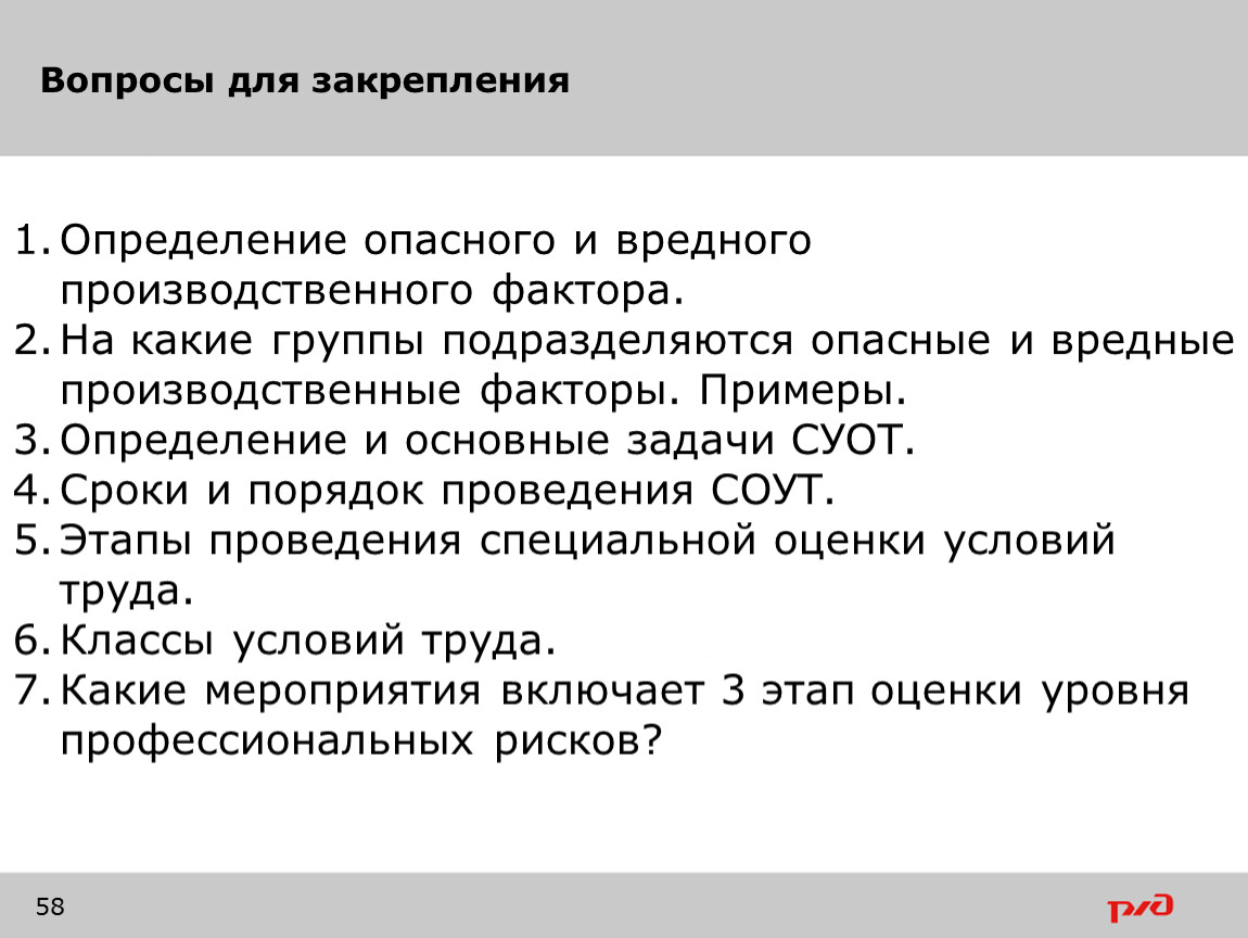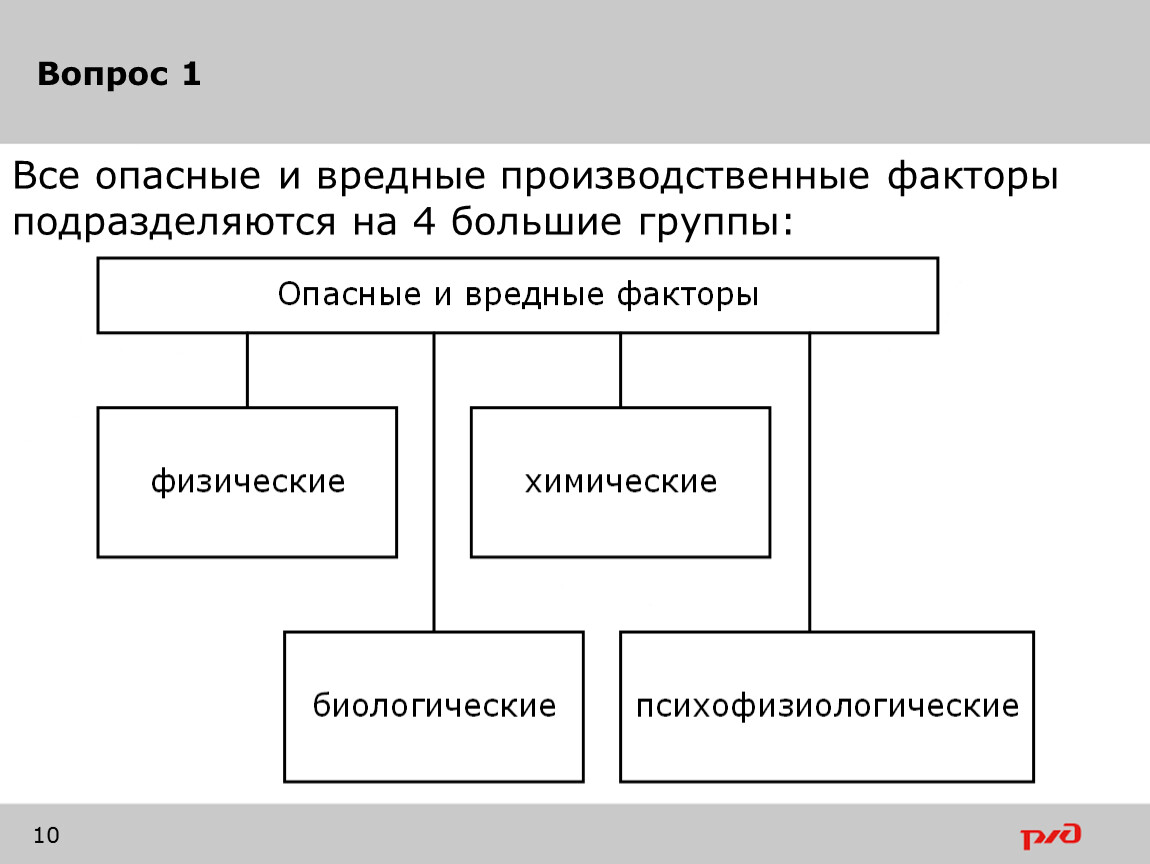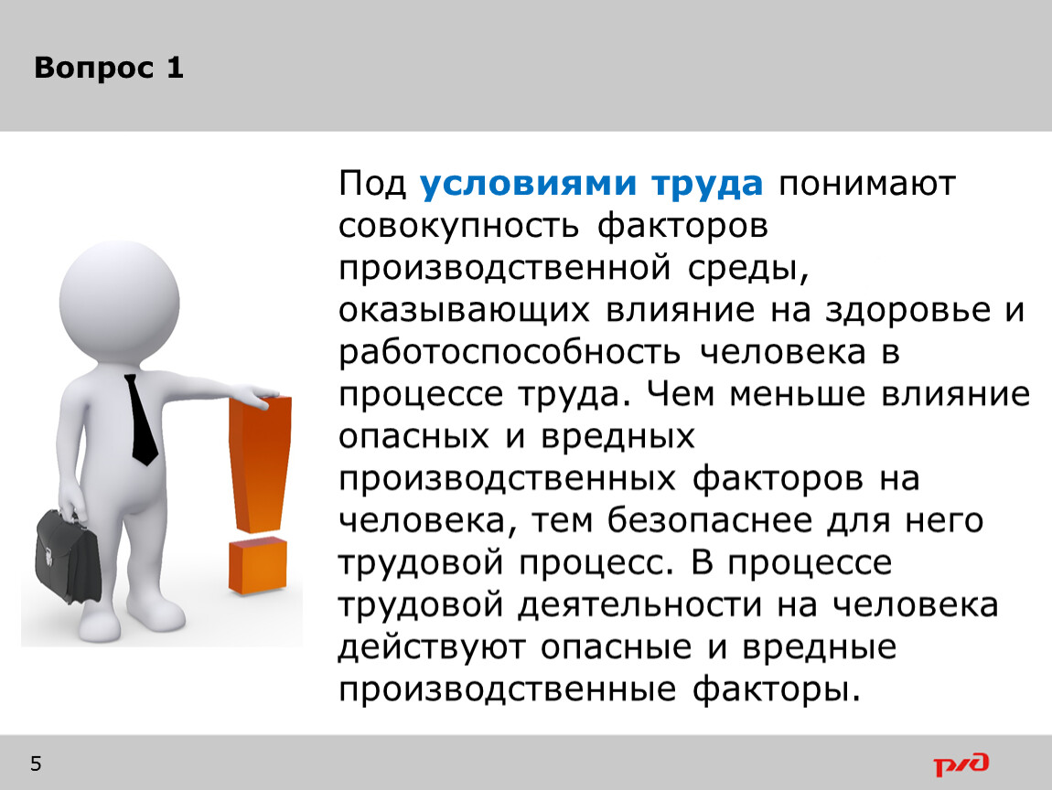 Под условиями труда понимают совокупность факторов производственной среды, оказывающих влияние на здоровье и работоспособность человека в процессе труда. Чем меньше влияние опасных и вредных производственных факторов на человека, тем безопаснее для него трудовой процесс. В процессе трудовой деятельности на человека действуют опасные и вредные производственные факторы.