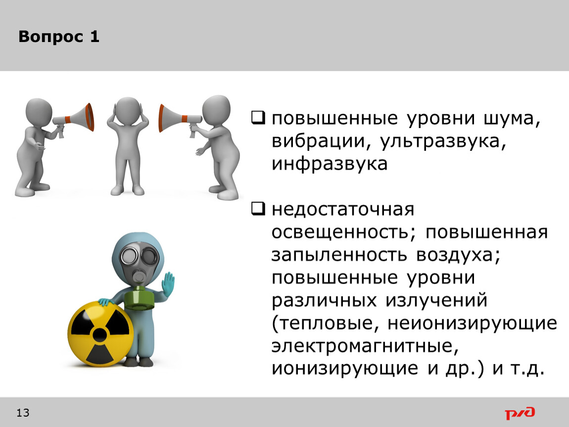недостаточная освещенность; повышенная запыленность воздуха; повышенные уровни различных излучений (тепловые, неионизирующие электромагнитные, ионизирующие и др.) и т.д.