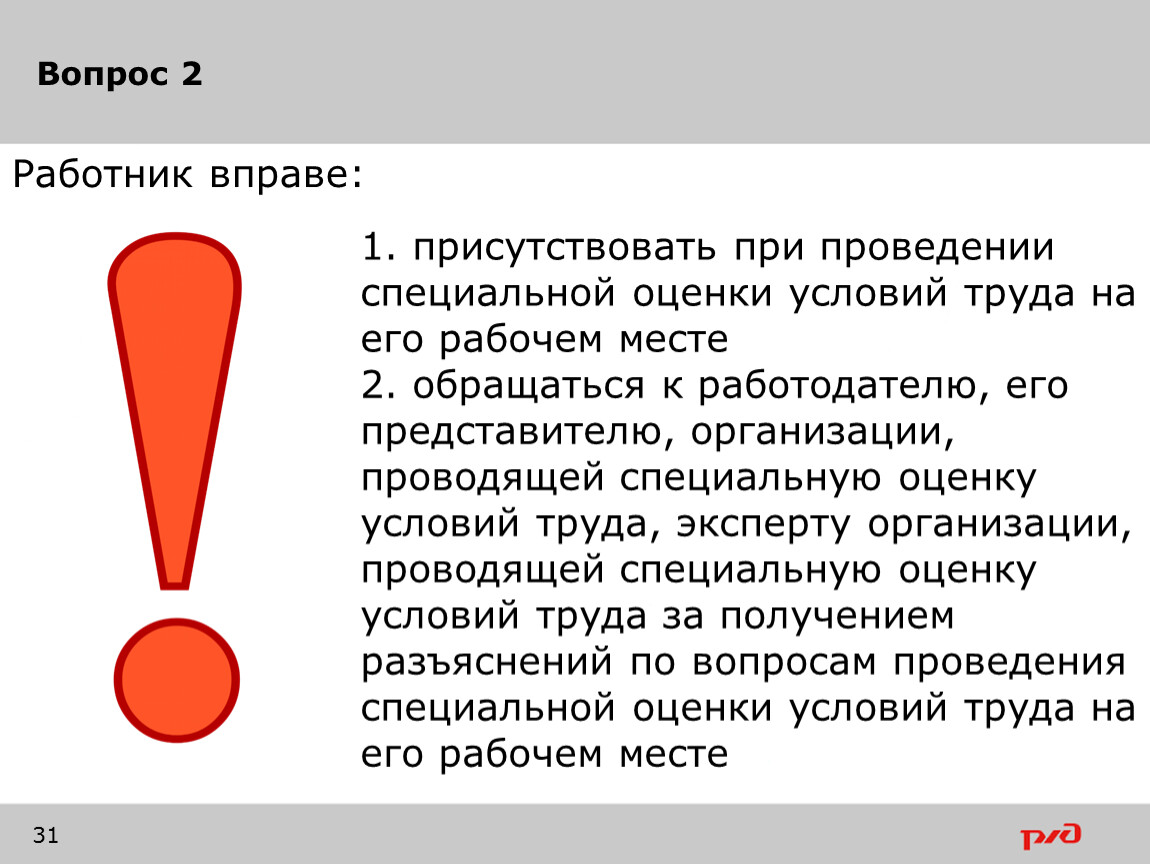 2. обращаться к работодателю, его представителю, организации, проводящей специальную оценку условий труда, эксперту организации, проводящей специальную оценку условий труда за получением разъяснений по вопросам проведения специальной оценки условий труда на его рабочем месте