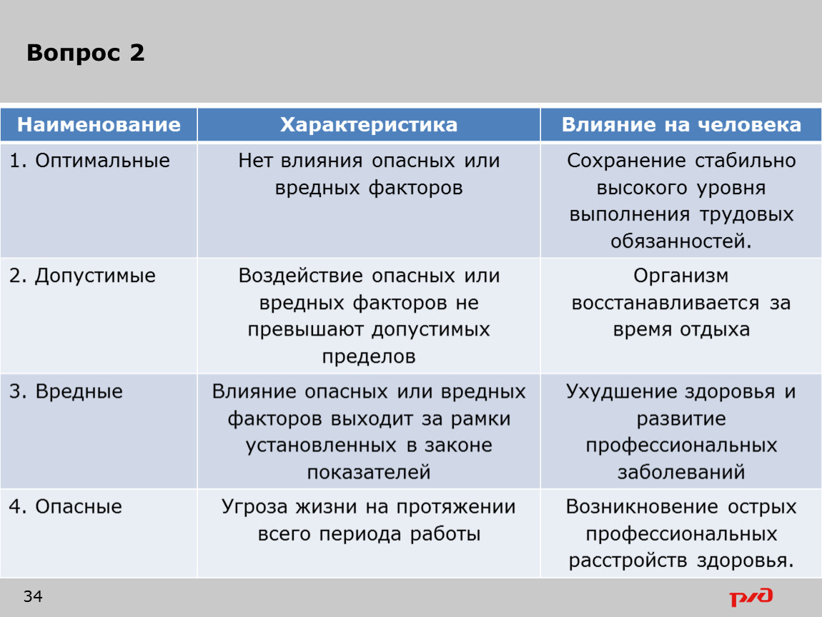 3. Вредные | Влияние опасных или вредных факторов выходит за рамки установленных в законе показателей | Ухудшение здоровья и развитие профессиональных заболеваний |