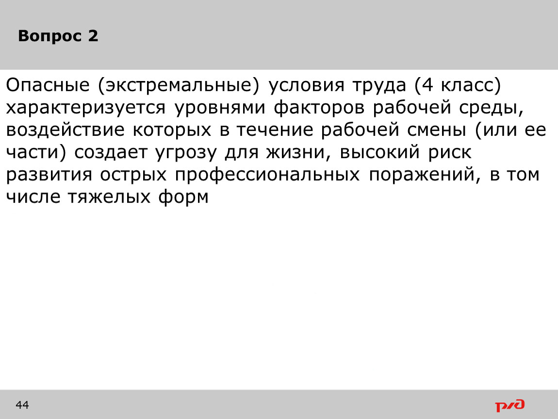 Опасные (экстремальные) условия труда (4 класс) характеризуется уровнями факторов рабочей среды, воздействие которых в течение рабочей смены (или ее части) создает угрозу для жизни, высокий риск развития острых профессиональных поражений, в том числе тяжелых форм