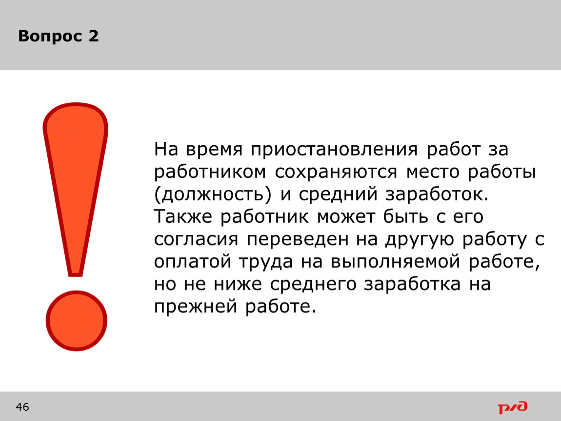 На время приостановления работ за работником сохраняются место работы (должность) и средний заработок. Также работник может быть с его согласия переведен на другую работу с оплатой труда на выполняемой работе, но не ниже среднего заработка на прежней работе.
