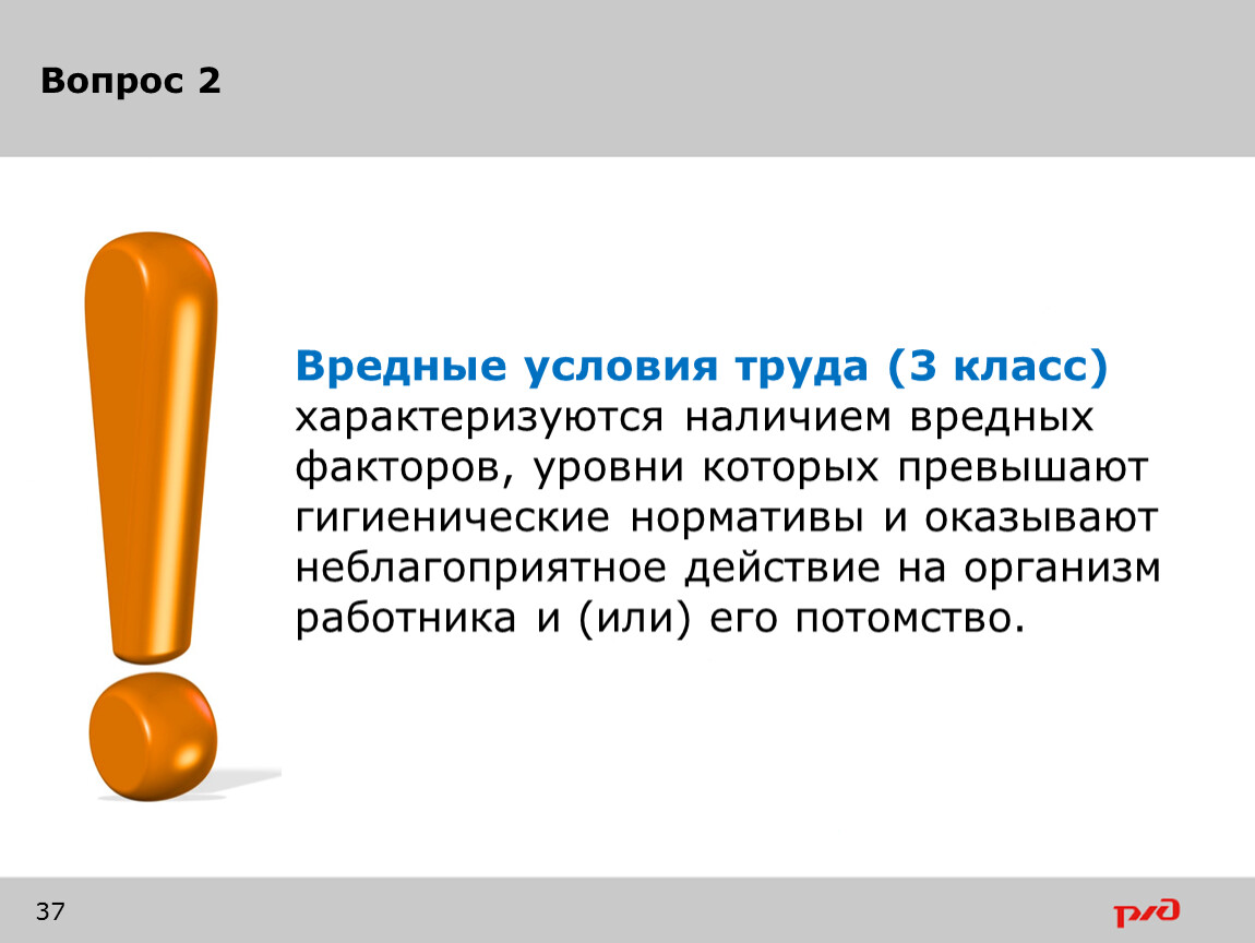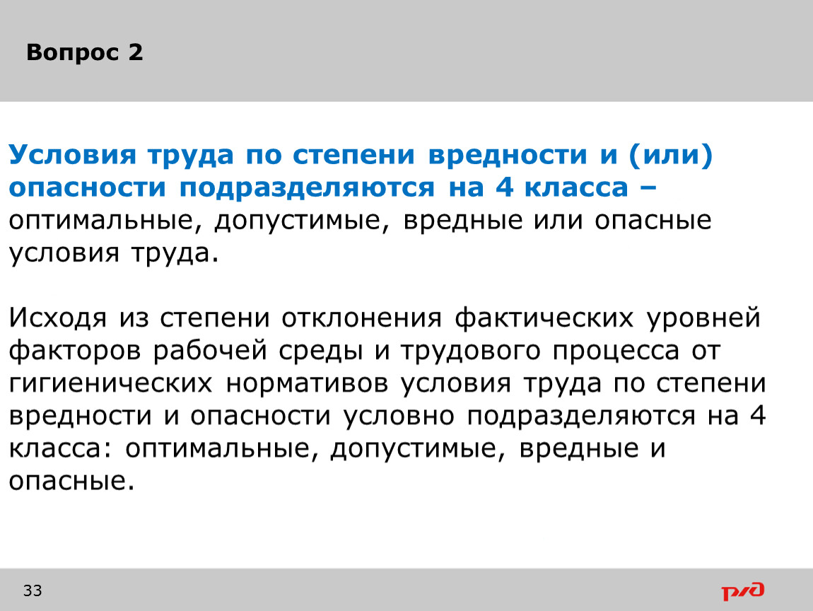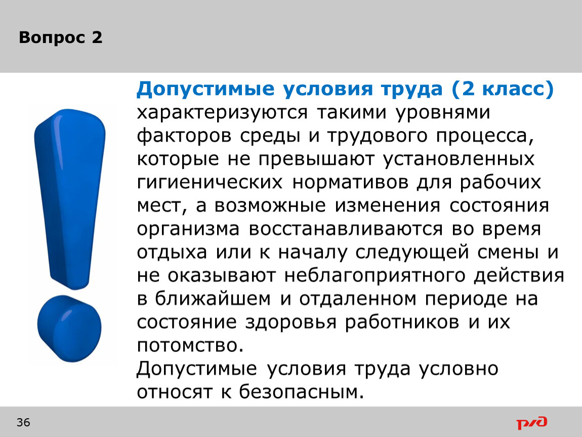 Допустимые условия труда (2 класс) характеризуются такими уровнями факторов среды и трудового процесса, которые не превышают установленных гигиенических нормативов для рабочих мест, а возможные изменения состояния организма восстанавливаются во время отдыха или к началу следующей смены и не оказывают неблагоприятного действия в ближайшем и отдаленном периоде на состояние здоровья работников и их потомство.